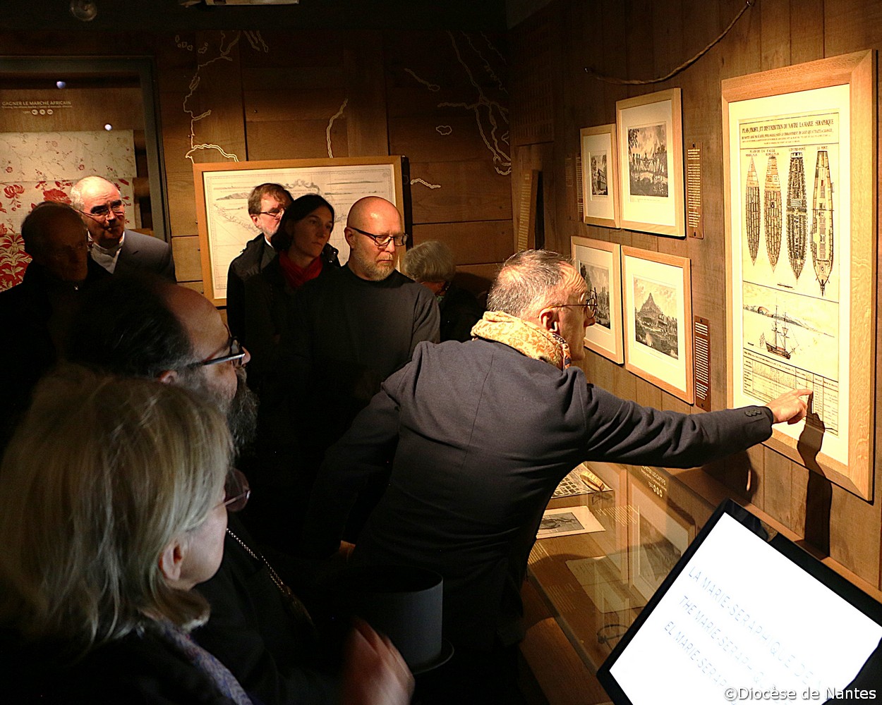 Accompagnés des représentants locaux des diverses confessions et du Service pour l’Unité des Chrétiens, cette délégation d’une trentaine de personnes a débuté la visite en découvrant les salles du Château des Ducs de Bretagne consacrées à « La traite Atlantique et l’esclavage », en présence de Mr Jean-Marc Ayrault, président de la Fondation pour la mémoire de l’esclavage. Ce dernier a resitué le contexte dans lequel a pu émerger à Nantes un travail de mémoire profond, documenté et d’avant-garde sur ce sujet pourtant si délicat : « Cela a été un grand travail de vérité. Des descendants d’armateurs ont ouvert leurs archives, tout comme le diocèse… En 1991, une exposition intitulée « Les anneaux de la Mémoire » a révélé l’ampleur de ce commerce. On estime qu’environ 1800 bateaux sont partis de Nantes et que 12 à 13 millions de personnes ont été réduites en esclavage, dont 1,5 million en France, dans les départements d’Outre-Mer. »