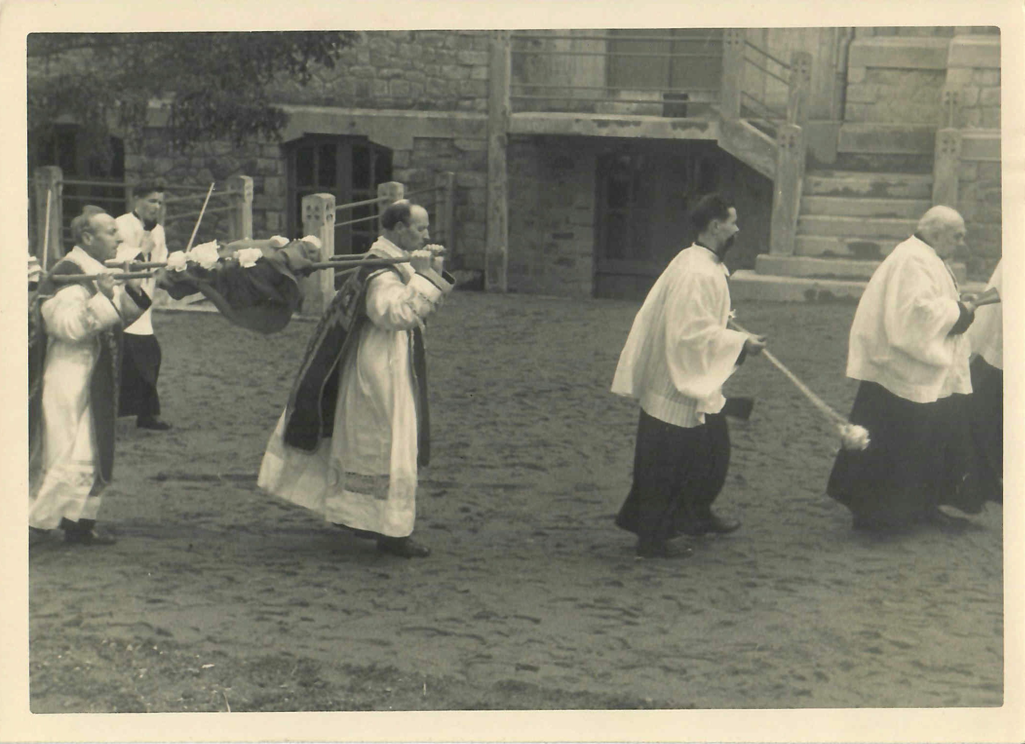 L’abbé Larose, curé de Sainte-Thérèse, et l’abbé Ollivier, curé de Notre-Dame-de-Lourdes, portent le brancard des reliques. (©Archives diocésaines de Nantes, 2Y016-109).