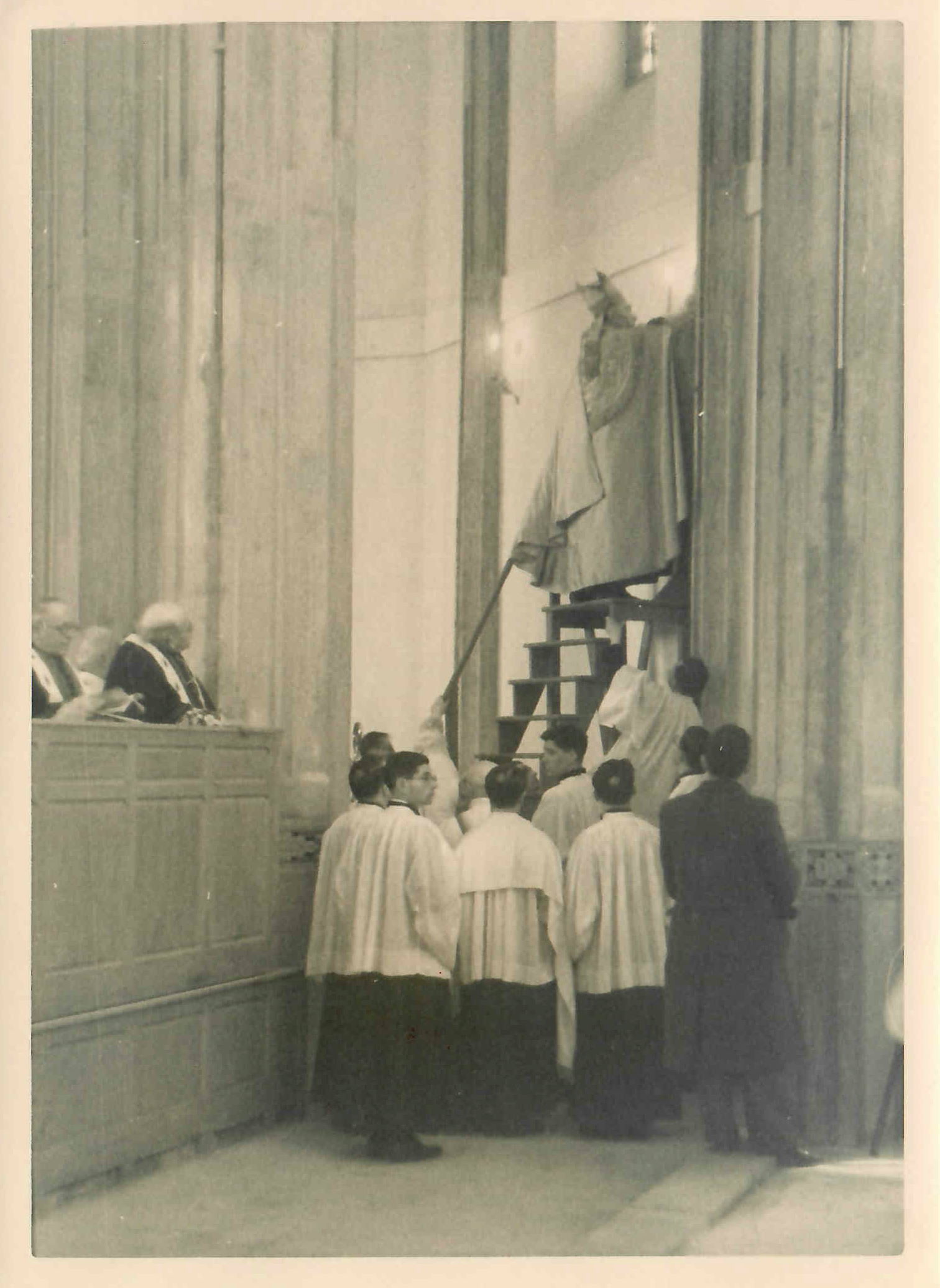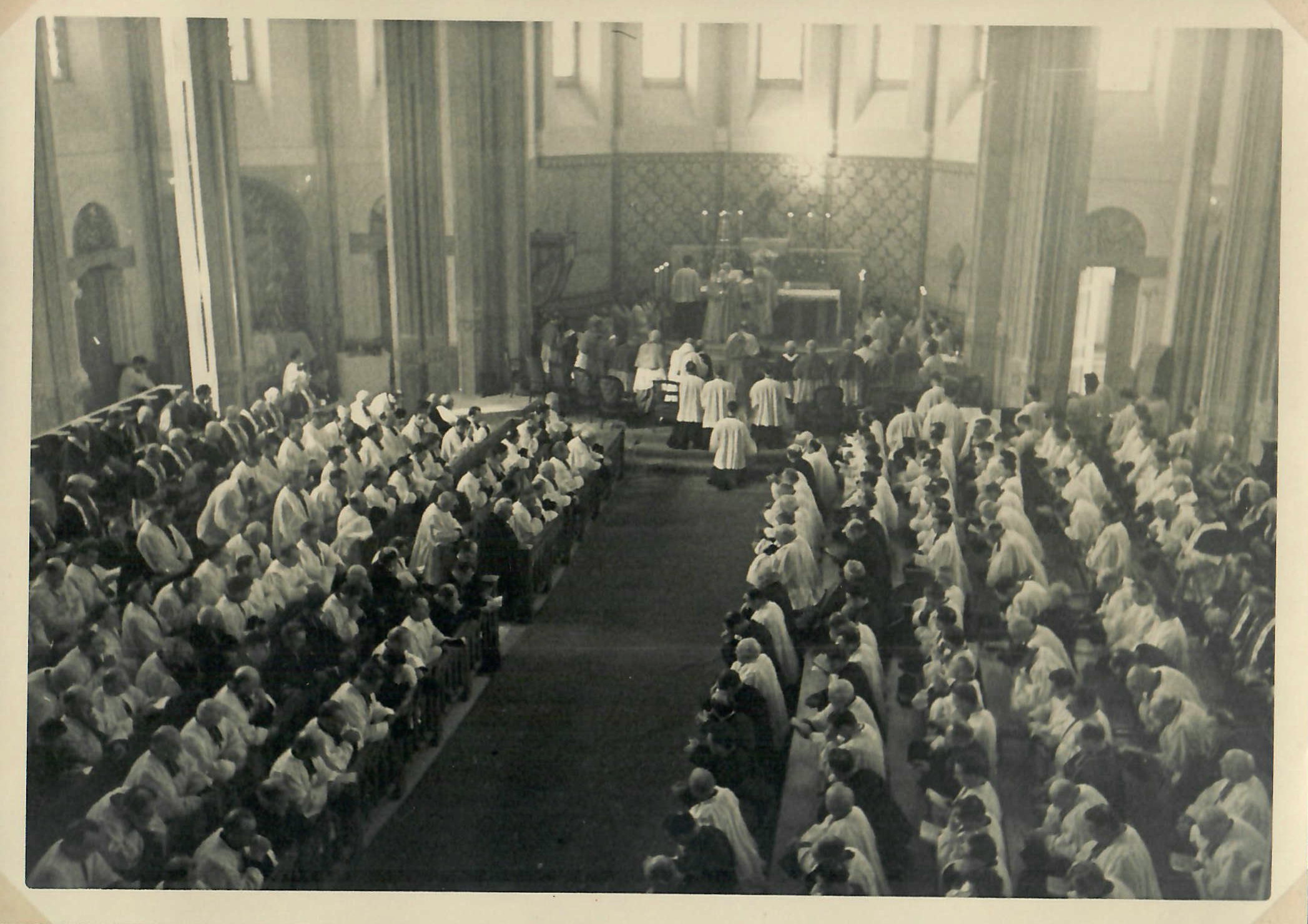 Le Séminaire est paré pour la fête par les séminaristes qui mettent eux-mêmes en place les décors. Sur la façade de la nouvelle chapelle, un Christ-Rédempteur gigantesque étend les bras dans un geste d’accueil. Sur les côtés, on aperçoit les blasons du cardinal, des archevêques et évêques consécrateurs.