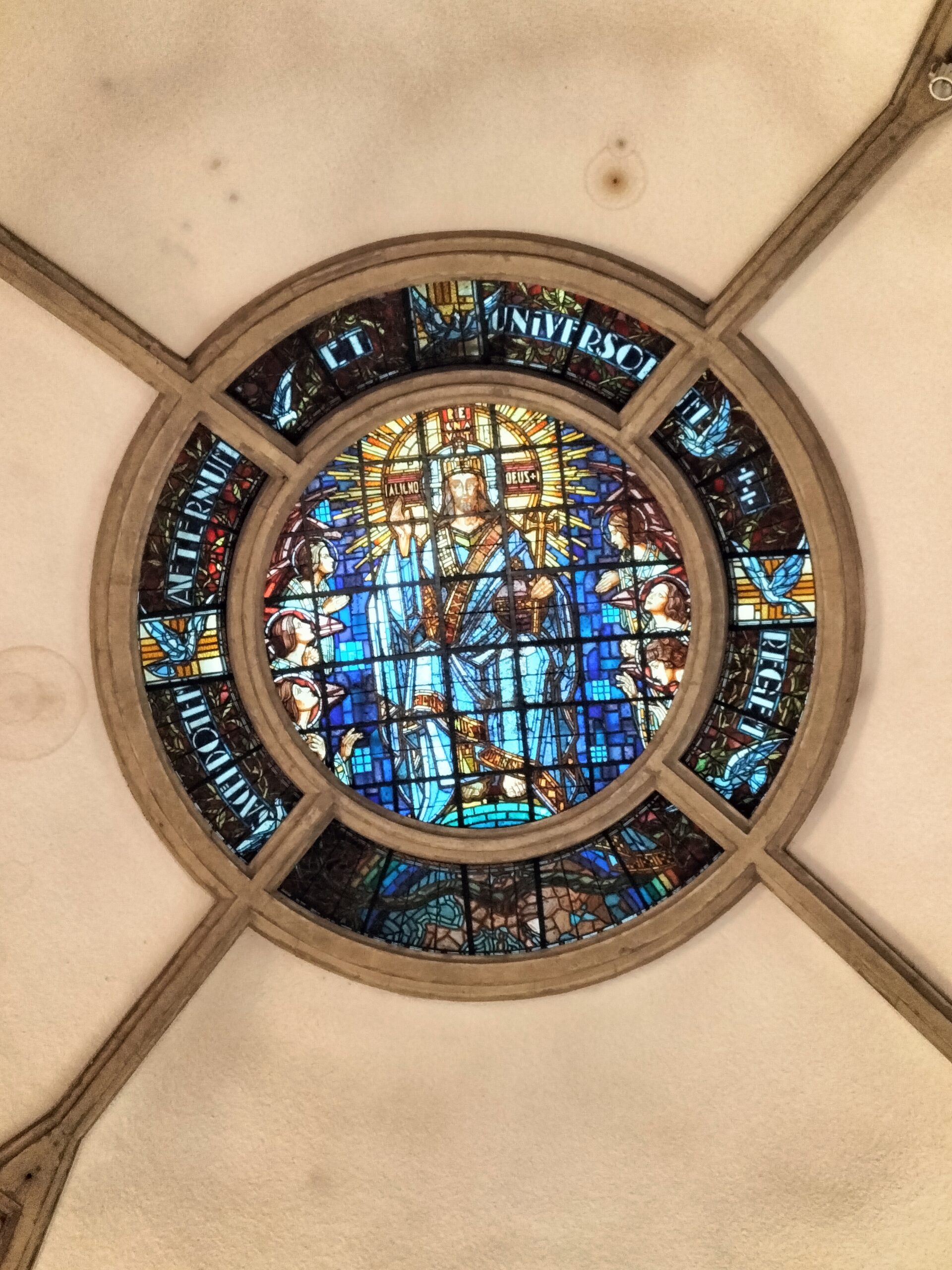 La verrière de la voûte représente le Christ Roi. Les 7 colombes rappellent les7 dons du Saint Esprit que le Christ envoie après son Ascension. La grande baie occidentale représente le Christ en Croix. A ses pieds, la Vierge du Stabat et Jean recueille le sang dans un calice. A gauche et à droite, les vierges de l’Annonciation et de la Pentecôte. La baie orientale est consacrée au Christ en gloire. Il tend ses mains transpercées. Sous ses pieds, jaillit la source d’eau vive où le cerf assoiffé vient boire. Sur les verrières plus étroites des absidioles, on peut voir les anges vêtus de dalmatiques représentant les béatitudes évangéliques. Le chœur est éclairé par 7 verrières qui ornaient le chœur de la chapelle de l’ancien grand séminaire.