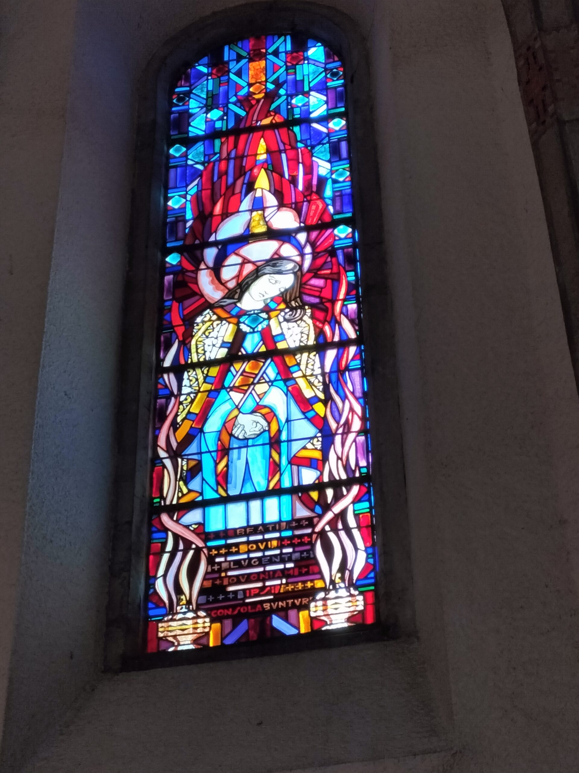 Un des vitraux des béatitudes évangéliques, absidiole de la Vierge (©Archives diocésaines de Nantes, 2022).