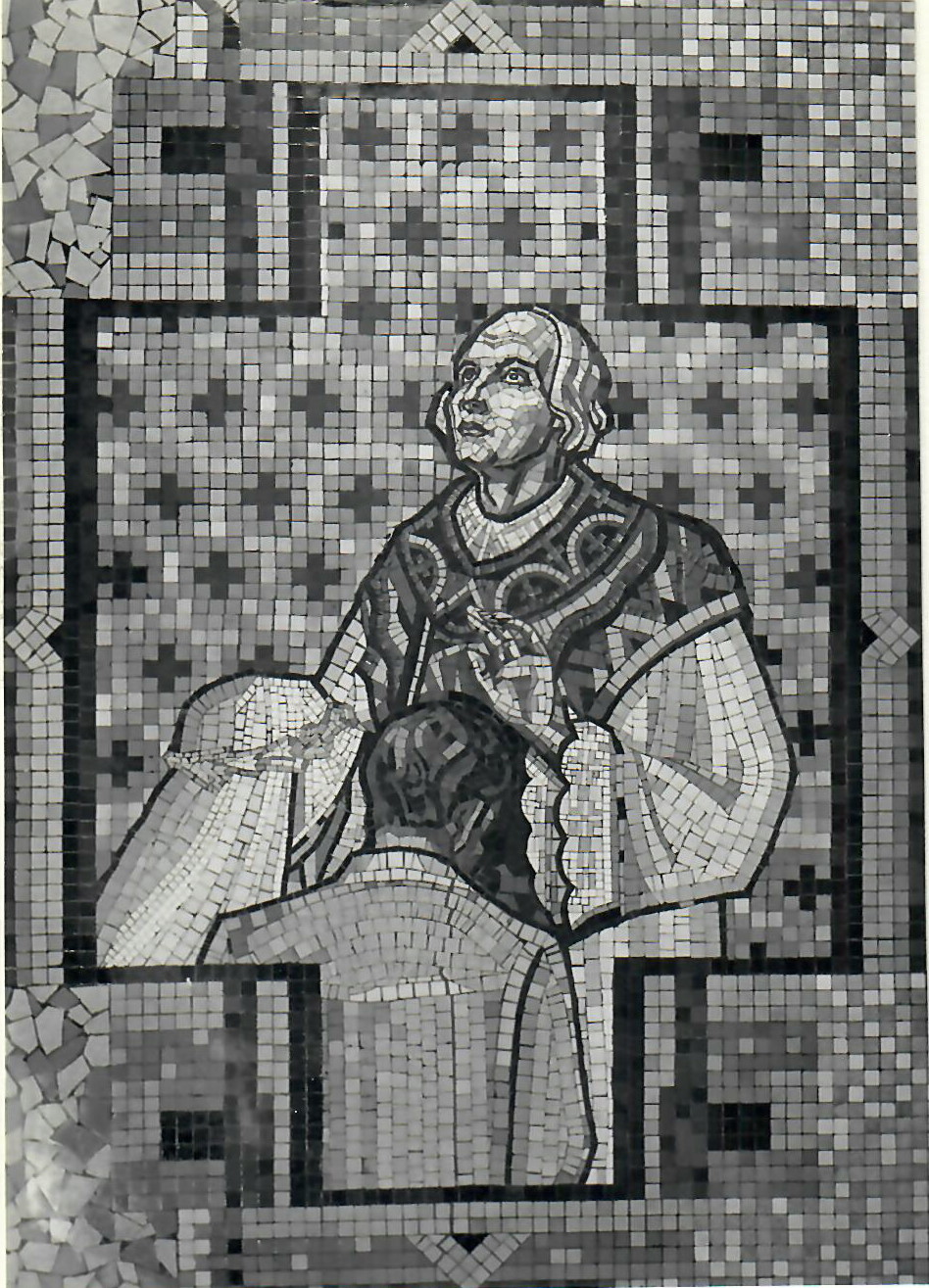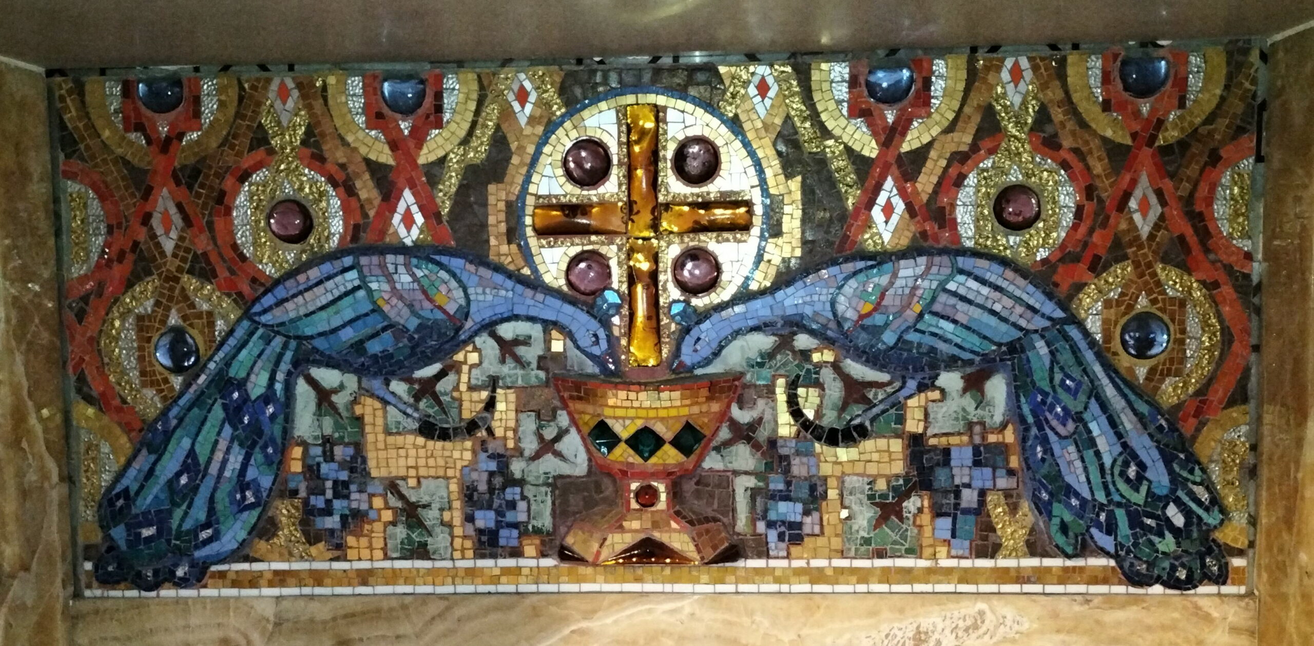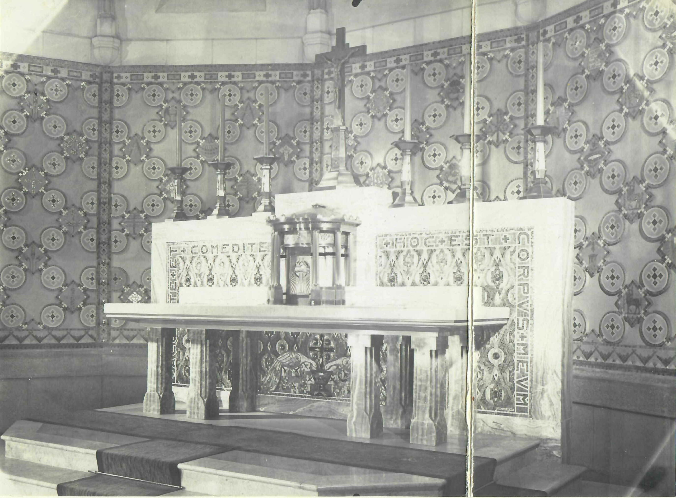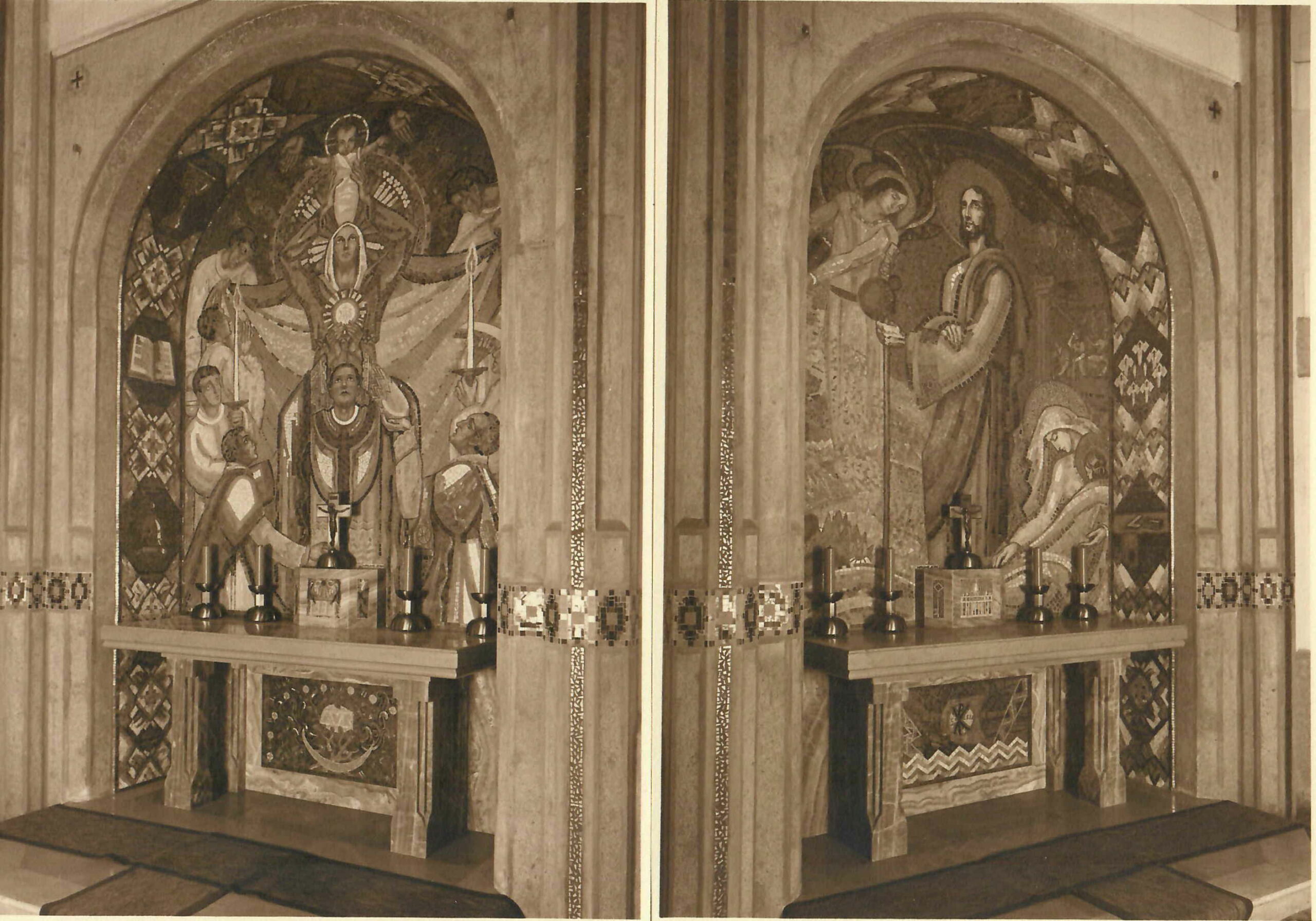 Le maître-autel est également orné de mosaïques. Le décor mural à l’arrière de l’autel n’existe plus actuellement.