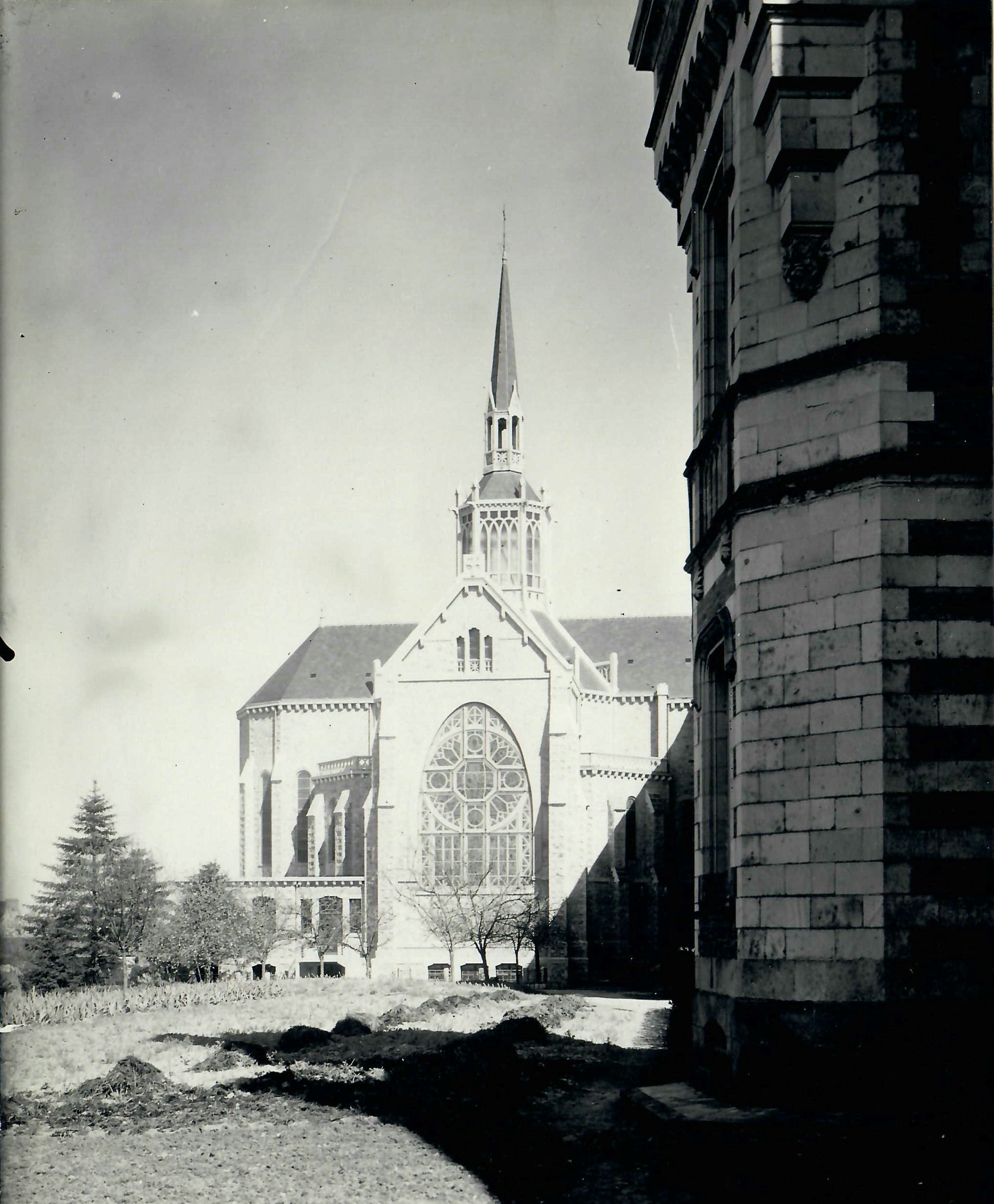 Vue extérieure de chapelle et de la grande verrière occidentale, 1937 (©Archives diocésaines de Nantes, 2Y016/210).