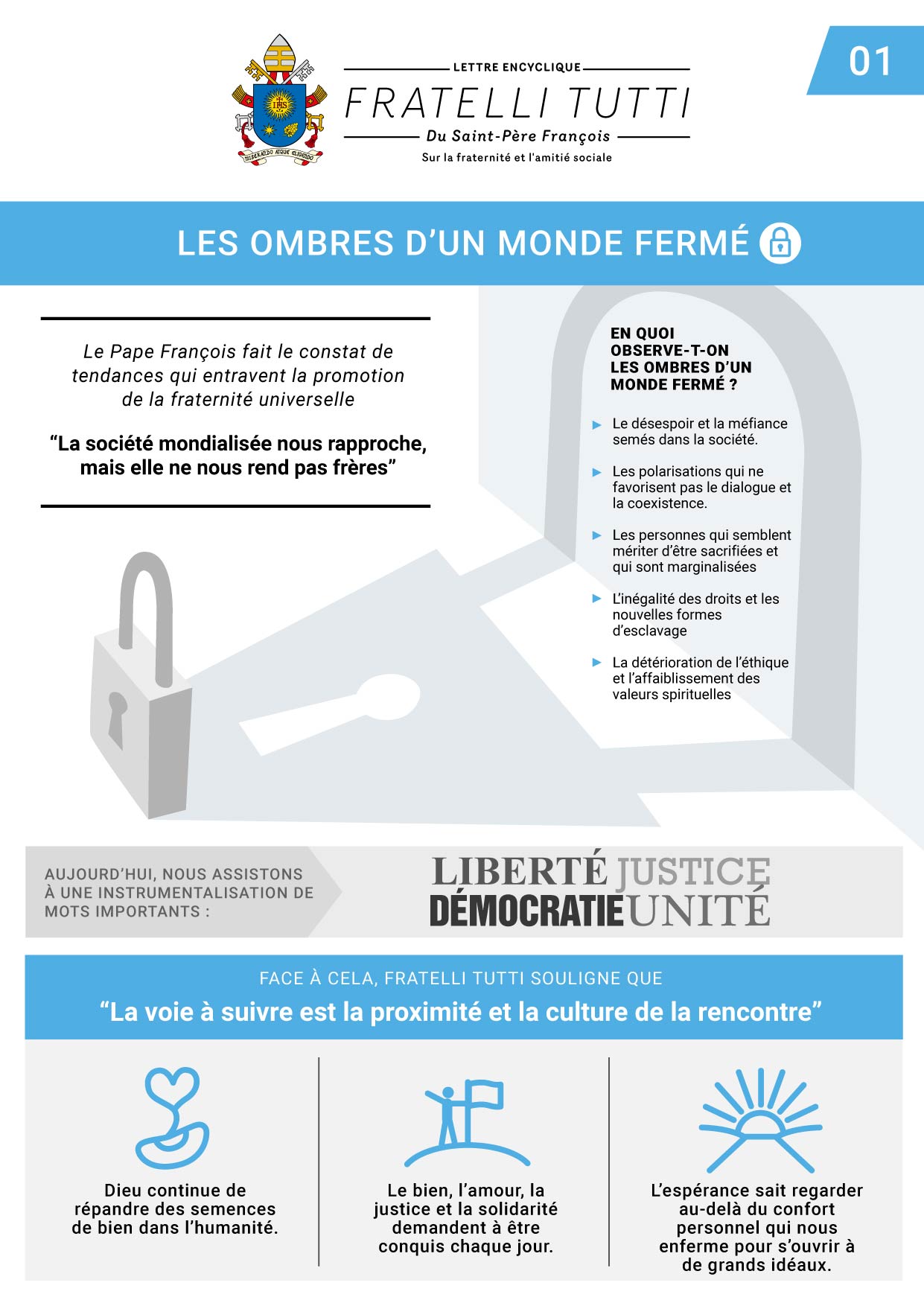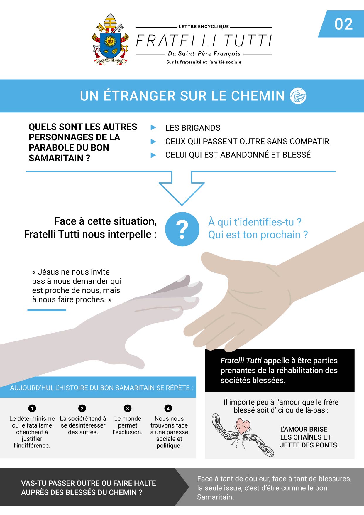 Les ombres d’un monde fermé (Chap. 1) se répandent sur le monde, laissant sur le bord de la route des personnes blessées, qui se trouvent exclues, rejetées. Ces ombres plongent l’humanité dans la confusion, dans la solitude et dans le vide. Nous rencontrons un étranger sur le chemin (Chap. 2) ; il est blessé. Devant cette réalité, deux attitudes sont possibles : passer outre sans compatir ou faire halte auprès de lui ; que nous choisissions de l’inclure ou, au contraire, de l’exclure, c’est là ce qui déterminera la nature de notre personne ou de notre projet politique, social et religieux.