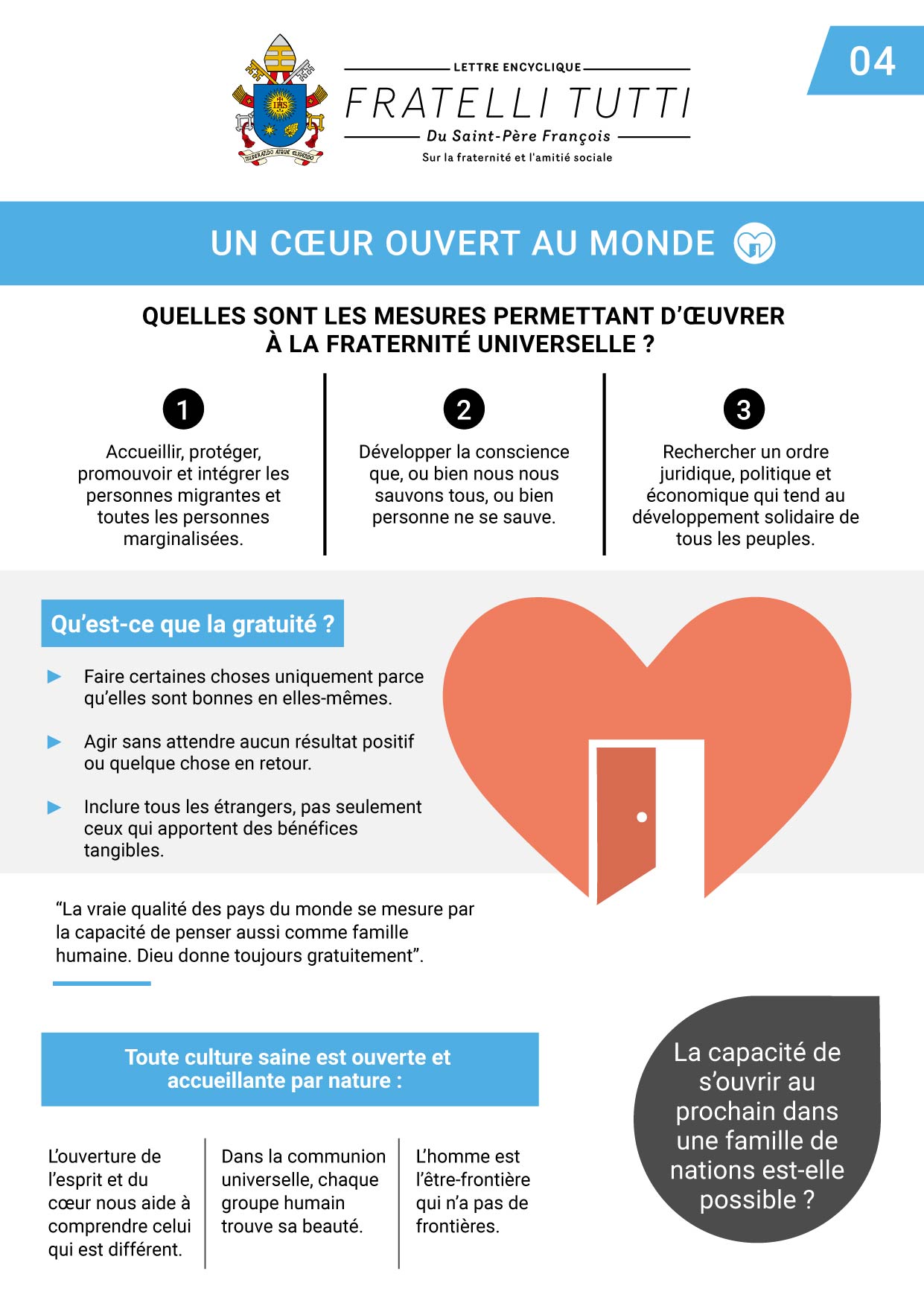 Dieu est amour universel, et tant que nous faisons partie de cet amour et le partageons, nous sommes appelés à la fraternité universelle, qui est ouverture. Il n’y a pas « les autres » ou « eux », il y a seulement « nous ». Nous désirons, avec Dieu et en Dieu, un monde ouvert (Chap. 3) (sans murs, sans frontières, sans exclus et sans étrangers), et pour cela nous avons et nous voulons un cœur ouvert. (Chap. 4) Nous vivons une amitié sociale, nous recherchons un bien moral, une éthique sociale, parce que nous nous savons membres d’une fraternité universelle. Nous sommes appelés à la rencontre, à la solidarité et à la gratuité.