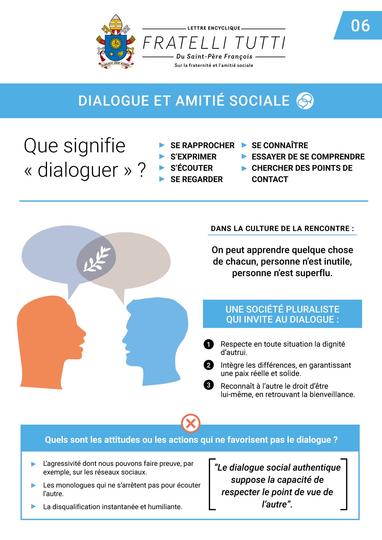 Savoir dialoguer est le chemin pour ouvrir le monde et construire l’amitié sociale (Chap. 6) ; et c’est le fondement pour une meilleure politique. Le dialogue respecte, accepte et recherche la vérité. Le dialogue donne naissance à la culture de la rencontre ; autrement dit, la rencontre devient un style de vie, une passion et un désir. Celui qui dialogue est bienveillant, reconnaît et respecte l’autre.