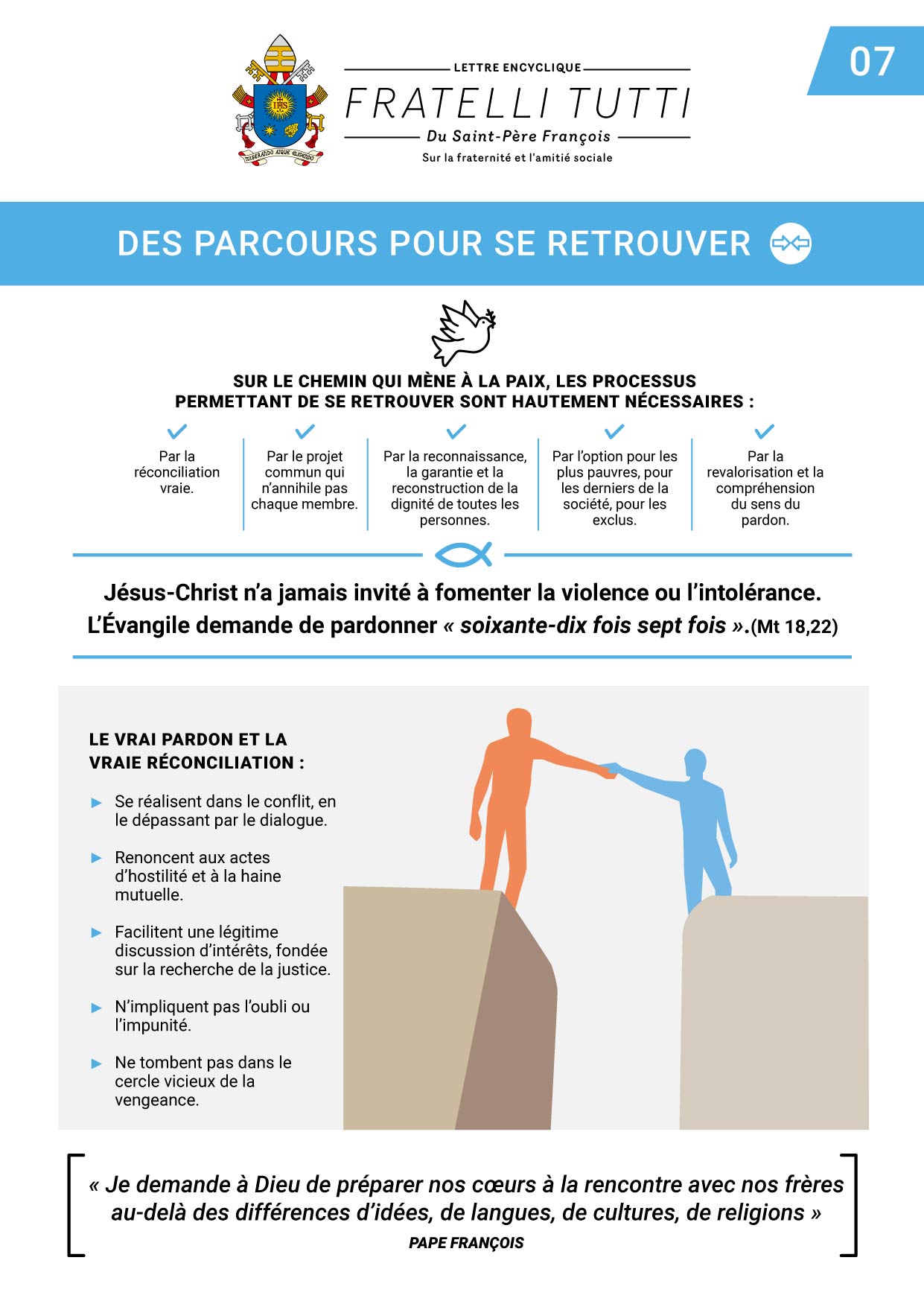 Mais cela ne suffit pas : il nous faut affronter la réalité des blessures de la rencontre qui a échoué, et, à la place, établir et parcourir les chemins d’une rencontre renouvelée. (Chap. 7) Il faut cicatriser les blessures et rétablir la paix. Pour cela, il nous faut être audacieux et partir de la vérité, partir de la reconnaissance de la vérité historique. Cette dernière est la compagne inséparable de la justice et de la miséricorde et est indispensable pour cheminer vers le pardon et la paix. Pardonner ne signifie pas oublier ; le conflit sur le chemin de la paix est inévitable, mais la violence n’est pas acceptable. C’est pourquoi recourir à la guerre est inacceptable et la peine de mort est une pratique à éradiquer.