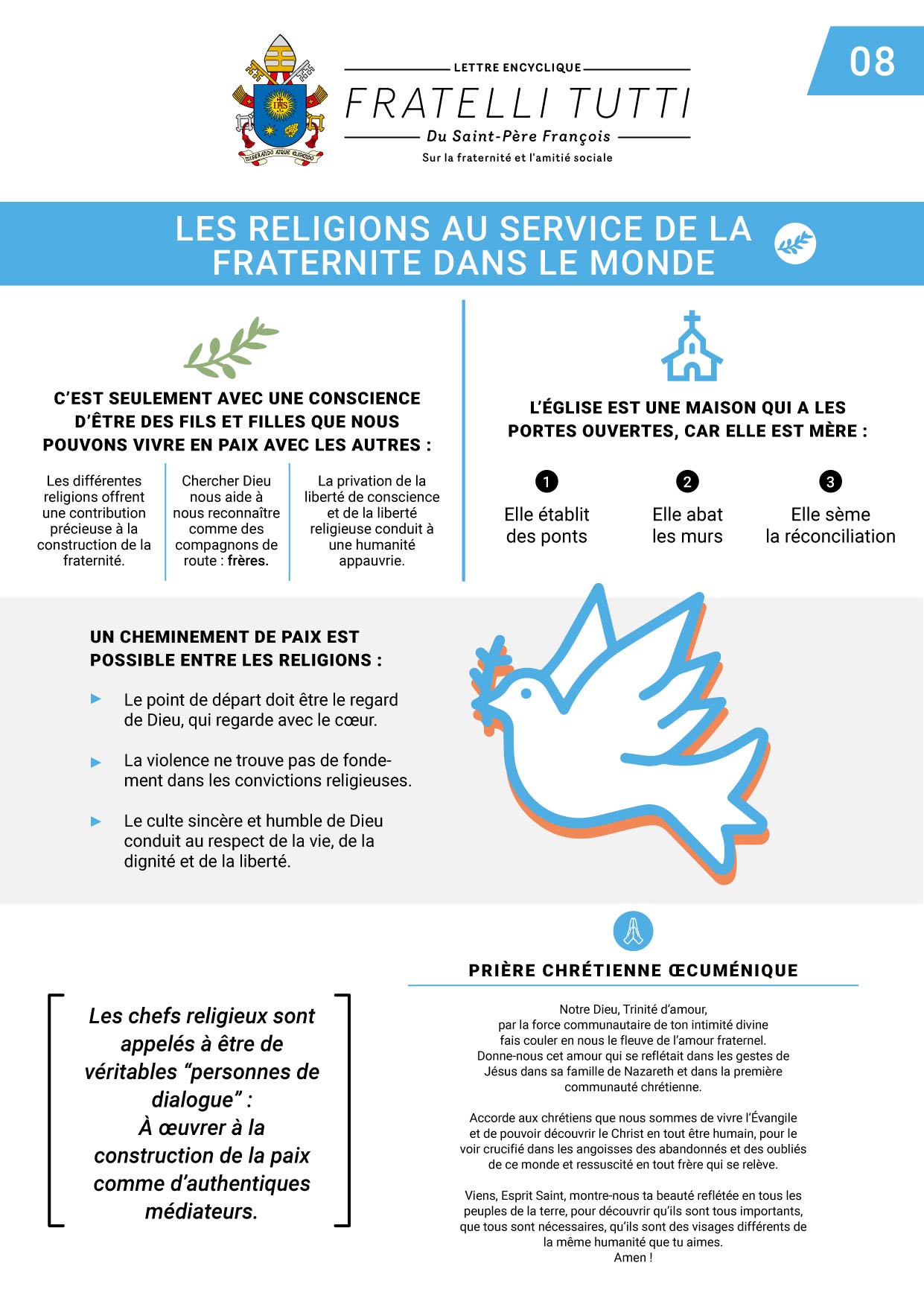 Les différentes religions du monde reconnaissent l’être humain comme créature de Dieu ; en tant que créatures, nous sommes tous dans une relation de fraternité. Les religions sont appelées à se mettre au service de la fraternité dans le monde (Chap. 8). En nous ouvrant au Père de tous, nous reconnaissons notre condition universelle de frères. Pour les Chrétiens, la source de la dignité humaine et de la fraternité se trouve dans l’Évangile de Jésus Christ, à partir duquel naissent nos actions et nos engagements. Ce chemin de fraternité nous donne aussi une Mère nommée Marie.
