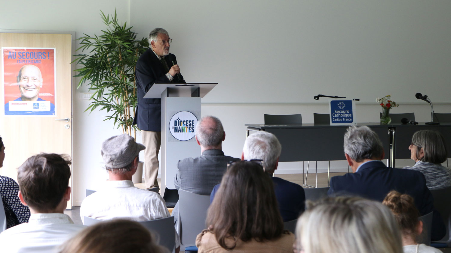 La promotion de la légion d’honneur janvier 2021 mentionnait Hervé Bonamy, président d’une délégation départementale d’une association de lutte contre l’exclusion, 42 ans de service : mention un peu courte pour une vie si bien remplie, a convenu Anne Duthilleul en introduction, mais en peu de mots, cela reprend l’essentiel du message qu’Hervé souhaitait donner à cette réception de la Légion d’honneur. C’est en tant que bénévole impliqué au Secours catholique qu’il a été honoré, et cette distinction honore toute la délégation passée, présente et à venir, pour son action auprès des plus fragiles et démunis. Relevant chez le récipiendaire trois qualités : la première est, à ses yeux, l’attention aux plus souffrants qu’elle associe à une citation de la philosophe Simon Veil « La plénitude de l’amour du prochain c’est simplement d’être capable de lui demander : quel est ton tourment ? », la qualité d’autorité dans le cadre d’une mission d’éducation, mis en œuvre dans une perspective de service et non de pouvoir afin de faire avancer tous ceux qui dépendaient directement ou indirectement de ses décisions. Enfin, la troisième qualité évoquée a été de se tourner vers les autres. En 2018, une semaine après avoir pris sa retraite de directeur diocésain de l’Enseignement catholique, Hervé Bonamy a accepté de s’engager au Secours catholique, en Loire-Atlantique durant cinq ans, puis au niveau national. C’est là qu’il a rencontré Anne Duthilleul qui lui reconnaît « un goût particulier pour mieux aider les autres à trouver leur place, à se faire entendre, à prendre des initiatives. En bureau national, a-t-elle assurée, il partage cette attitude et cette attention aux autres quels qu’ils soient, par sa prudence, son souci de ne pas trancher trop vite, de prendre tous les points de vue en considération, de bâtir ensemble la mission confiée ».