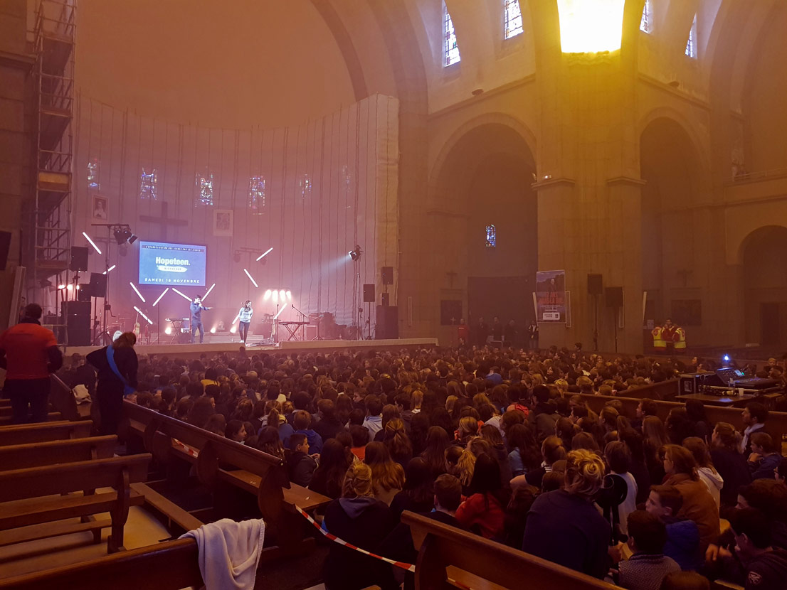 Dans le titre de l’événement « Hopeteen » on retrouve mêlés le nom d’un groupe de louange déjà connu des Nantais : Hopen (présents lors des JEM 2017) et le terme anglais teenagers (adolescents) public auquel s’adressait directement l’événement. Des paroissiens de Saint-Jean-Paul-II dont les enfants avaient expérimenté à Paris ces rassemblements ont proposé l’initiative, qui s’est montée petit à petit. Les inscriptions sont arrivées en grand nombre, et d’au-delà du diocèse… Ce samedi après-midi, les bancs de l’église avaient été rangés pour accueillir ce flot de jeunes à Sainte-Thérèse.