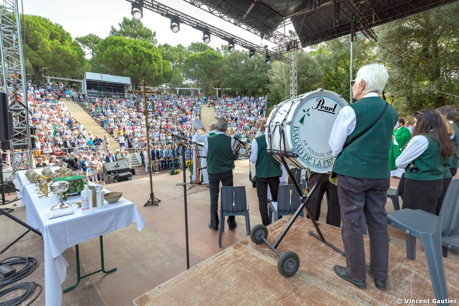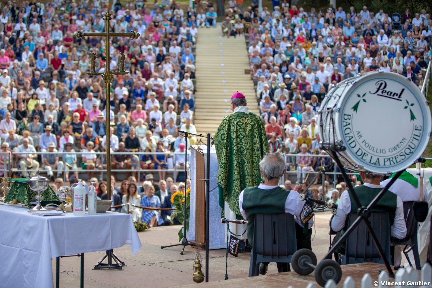 Cette année Mgr Laurent Percerou, accompagné par le père Christophe de Cacqueray, curé de la paroisse Notre-Dame-et-Sainte-Thérèse-de-la-Baule, présidait pour la première fois la messe, dans l’étonnant parc des Dryades, amphithéâtre de verdure, qui a accueilli plusieurs centaines de personnes pour l’occasion. Les cantiques bretons ont résonné, accompagnés par le bagad de la presqu’île « Ar poulig gwenn« .