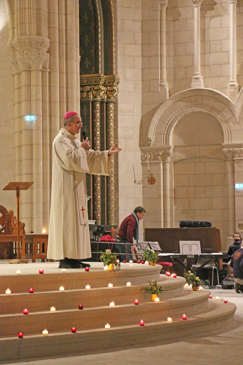 Un « jeu de piste » organise la déambulation en groupes dans l’édifice. De tableaux en vitraux, des animateurs invitent les jeunes à créer un vitrail des Enfants Nantais, à remettre de l’ordre dans les différents temps de la messe, ou à se recueillir, dans la crypte près du tombeau des saints Donatien et Rogatien. Les jeunes sont impressionnés par la blancheur et les proportions de la basilique qui, au fil de la soirée, s’illumine de petites votives qui accompagnent finalement la veillée de louange et d’adoration, jusqu’à leur être remises comme un envoi en mission. Après cette soirée il faut « redescendre de la montagne, leur dit Mgr Percerou, je vous envoie pour porter la lumière de l’Évangile là où vous vivez, manifestez que ce monde a un sens, ensemble, faisons en sorte que notre Église soit accueillante pour tous ! ».