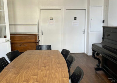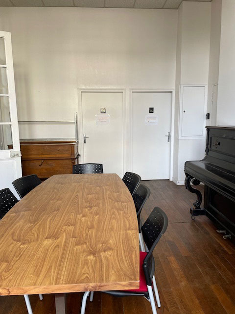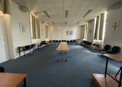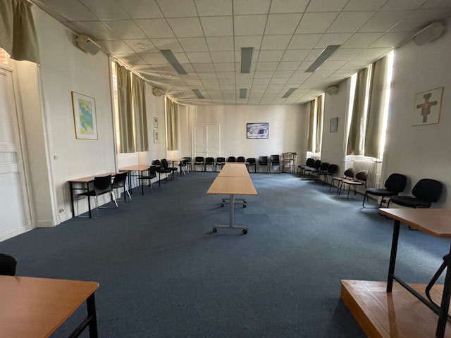 Cette salle est agréée ERP jusqu’à 65 personnes (entrée avec vestiaire et sanitaires, vidéoprojecteur et sono à disposition).