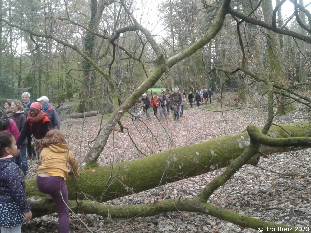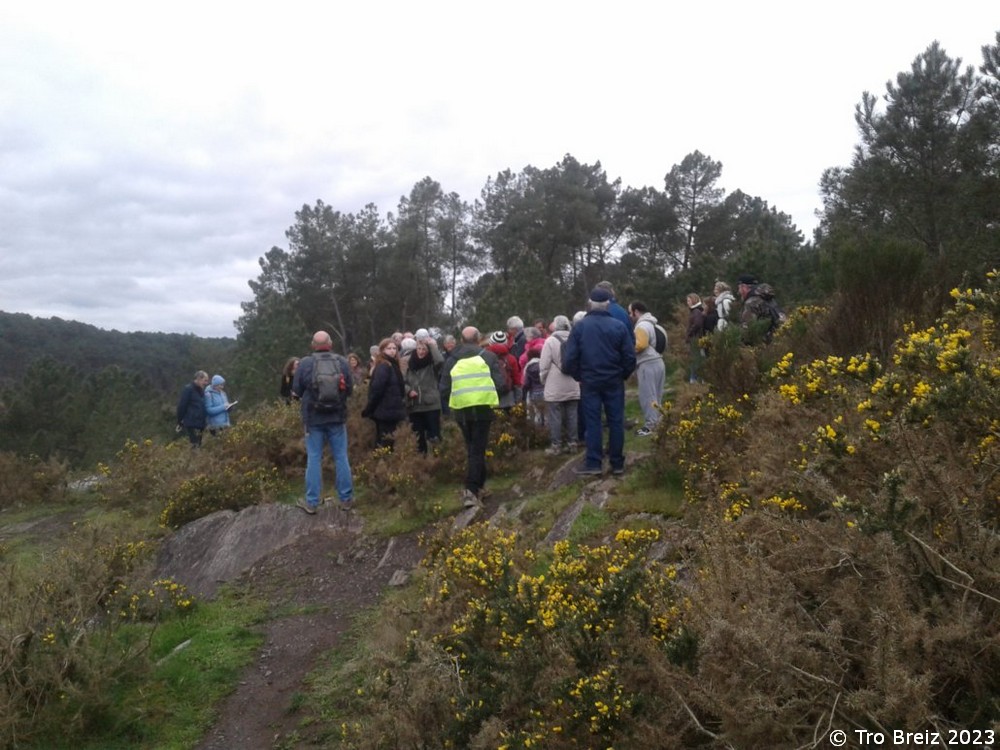 Le chalet Sainte-Anne nous accueille pour un sympathique pique-nique d’une cinquantaine de convives. Départ avec le Père Arnaud vers le Bois de Juzet, forêt de résineux à affleurement de schiste, associé à la fée Carabosse, point culminant en rebord de plateau ; il faudra descendre un sentier parfois très escarpé, entre ajoncs et genêts avec quelques glissades involontaires… jusqu’au gué d’un ru naissant de source, qui, comme notre groupe, rejoint le Don qui ira grossir la Vilaine !