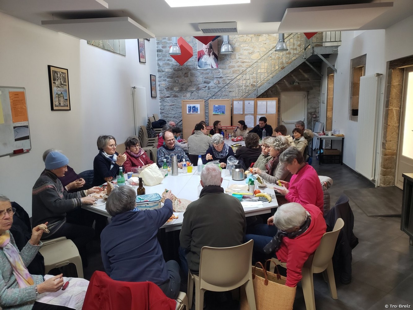 Pique-nique au chaud à la salle paroissiale sainte-Anne, retrouvailles pour beaucoup (dont les « cousines » nos jeunes et joyeuses habituées), et présentation des nouveaux venus; échanges, souvenirs, anecdotes des Trobreiz communs, projets pour celui de 2024 ou autres rendez-vous.