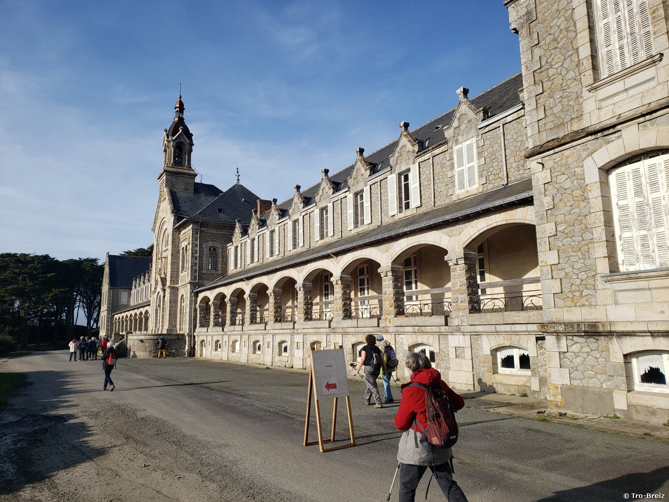 A la pointe, nous apercevons sur l’autre rive Le Croisic, son clocher, son port, sa criée, nous dominons les Petit Traict et Grand Traict (départ des étiers alimentant les marais salants), puis pénétrons dans le domaine de l’ancien Centre héliomarin de Pen Bron , fondé en 1887 par H. Pallu grâce à de généreux donateurs, pour les enfants atteints de tuberculose, et tenu par les sœurs de Saint-Vincent-de-Paul; il deviendra centre de rééducation fonctionnelle jusqu’à sa fermeture en 2017; un remarquable bâtiment XIXème se dresse, au centre duquel trône une chapelle où nous attend Andréa Le Masne (auteur de « Pen Bron »)-un immense merci à elle- : elle nous raconte avec passion l’histoire de ce site, et en particulier de cette grande chapelle, exigée par les sœurs, à la construction de laquelle œuvreront les plus grands artistes locaux de l’époque!