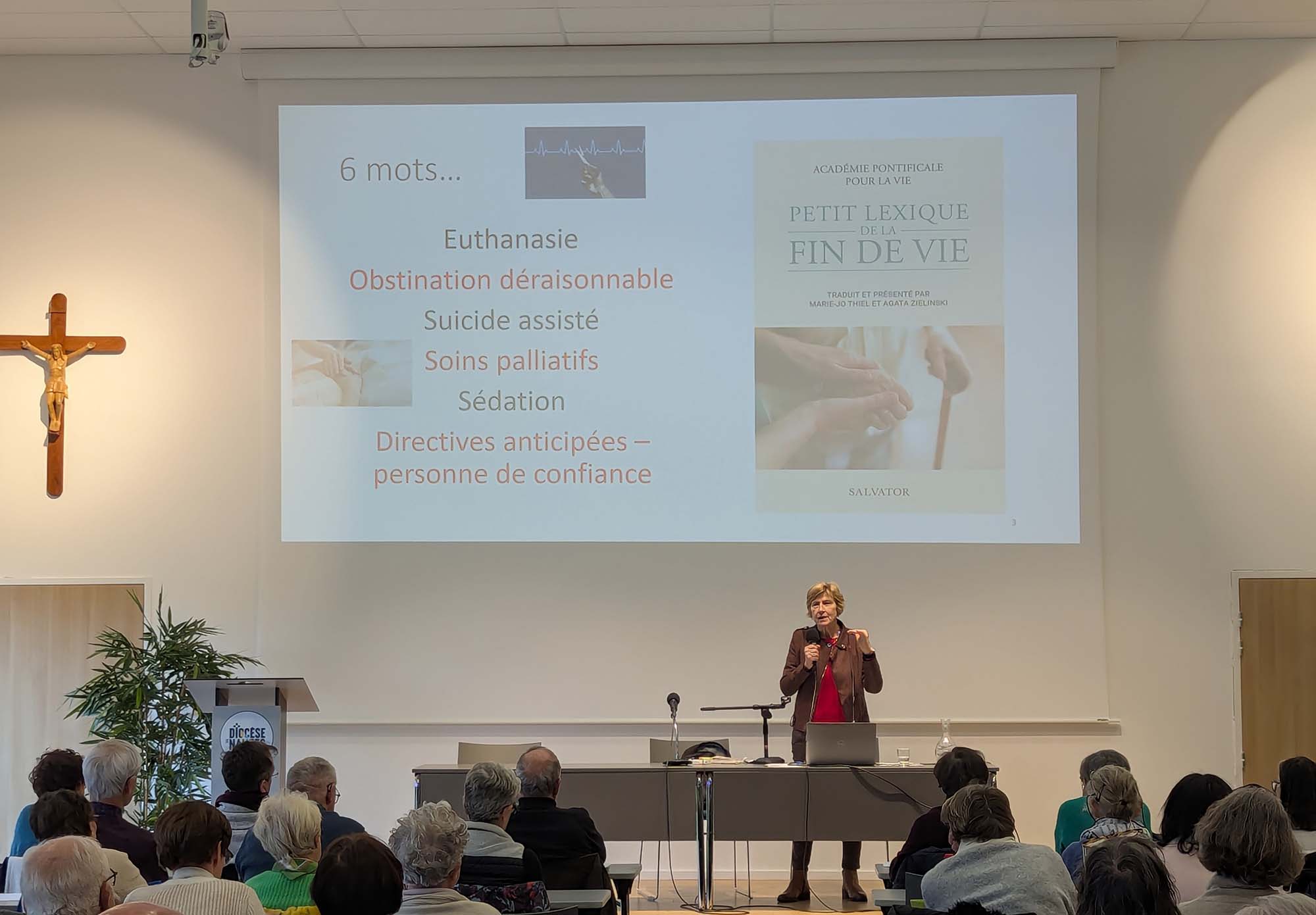 À travers ces journées de formation ouverte au grand public, il ne s’agissait pas seulement de parler de la mort, mais surtout de parler de la vie jusqu’à son terme, de l’accompagnement, de l’écoute, du soin et du respect de la personne. Comment être présents auprès de ceux qui vivent la fin de leur parcours ? Comment conjuguer compétence médicale, discernement éthique et attention à la dimension humaine et spirituelle ? Autant de questions que Madame Thiel nous aide à approfondir.