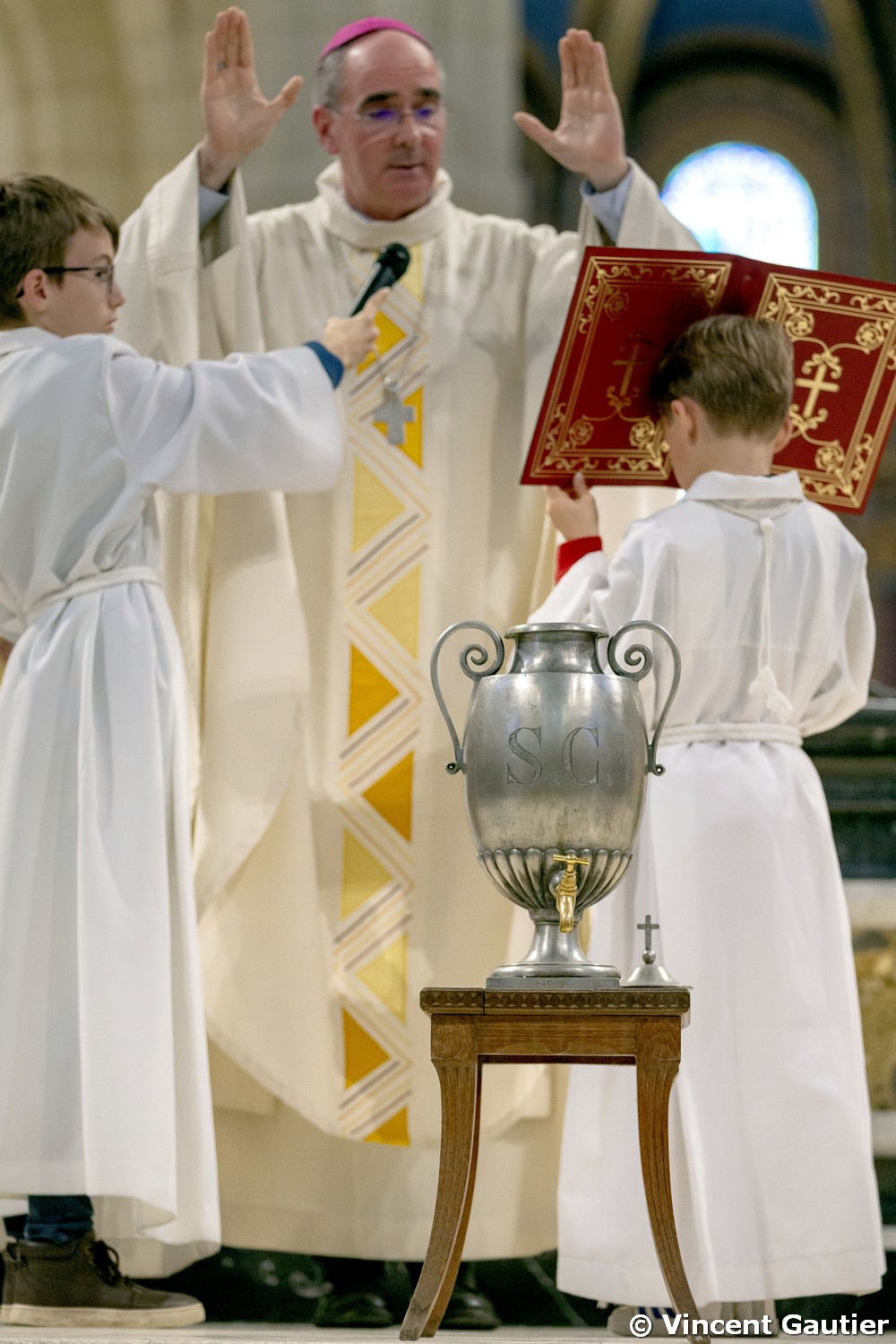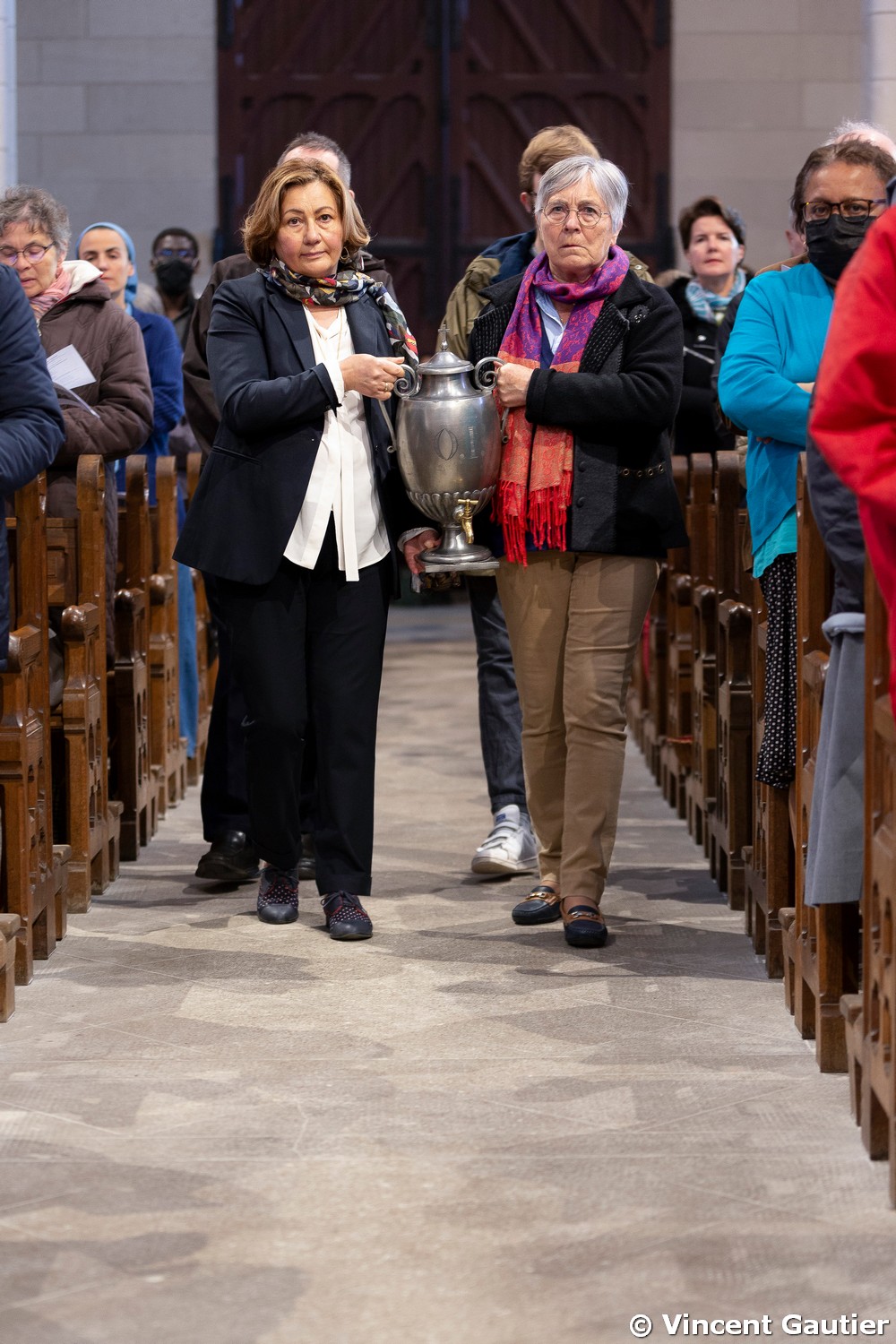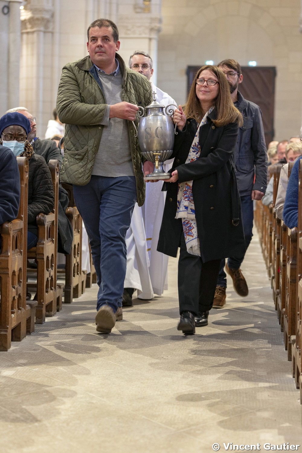 La bénédiction de l’huile des malades a placé au cœur de l’assemblée ceux que la tendresse de Dieu rejoint tandis qu’ils peinent à marcher. Au moment de la bénédiction de l’huile des catéchumènes, l’assemblée a prié pour ceux qui rejoindront cette année le peuple de Dieu dans sa marche au milieu du monde. La consécration du Saint-Chrême a rappelé à tous la commune vocation à accueillir en leurs vies le souffle de Dieu, pour marcher vers lui et vers nos frères en nous soutenant les uns les autres.