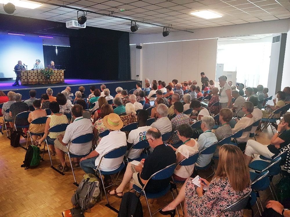 Durant trois journées les 150 participants ont tenté de faire bouger leurs représentations autour du sujet.    « Aucun discours ne pourra convaincre, seule la rencontre peut faire tomber nos peurs » résumait l’animateur en début de rencontre. Chacun arrivait avec sa propre expérience personnelle « cela fait trois ans que nous nous sommes renseignés auprès d’organismes pour accueillir un migrant, et finalement nos voisins nous ont demandé un coup de main pour Ibrahim il y a 10 jours et tout se passe très bien ». CVX s’était entouré de plusieurs associations particulièrement investies sur le terrain pour avoir la vision la plus claire de la situation, des enjeux et des solutions possibles : Le Secours catholique, JRS Welcome, l’association rennaise « Bienvenue », le CCFD Terre solidaire, Une famille un toit ou encore SOS Méditerranée… Par des ateliers, des conférences, le cheminement s’est fait en trois temps : comprendre les migrations, oser la rencontre et en recueillir les fruits. Guy Aurenche, ancien président du CCFD a marqué par son invitation vive et sans équivoque : « S’il est difficile de gérer l’autre, il est aussi difficile de vivre sans lui. La fraternité est un principe constitutionnel de notre pays, mais il faut aujourd’hui choisir personnellement de défendre la dignité et décliner cet impératif dans les droits et devoirs de notre vie quotidienne. Plus qu’une crise migratoire, nous vivons une crise de l’hospitalité ! ».