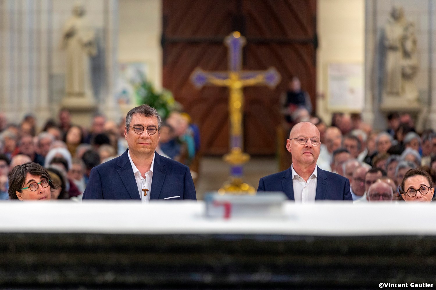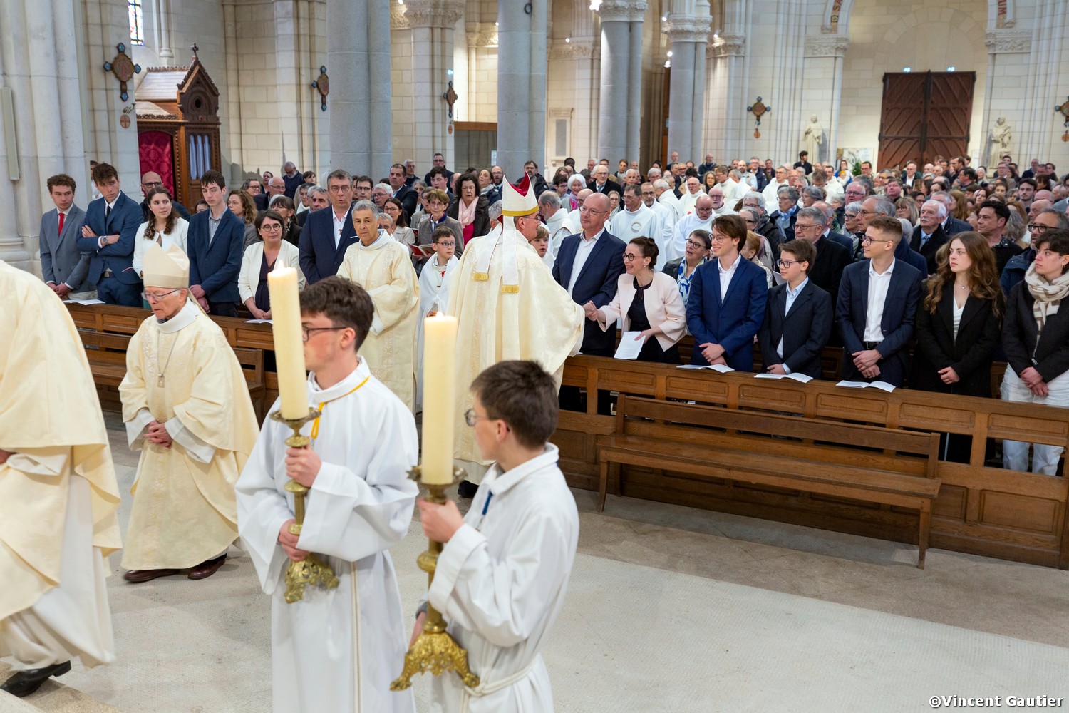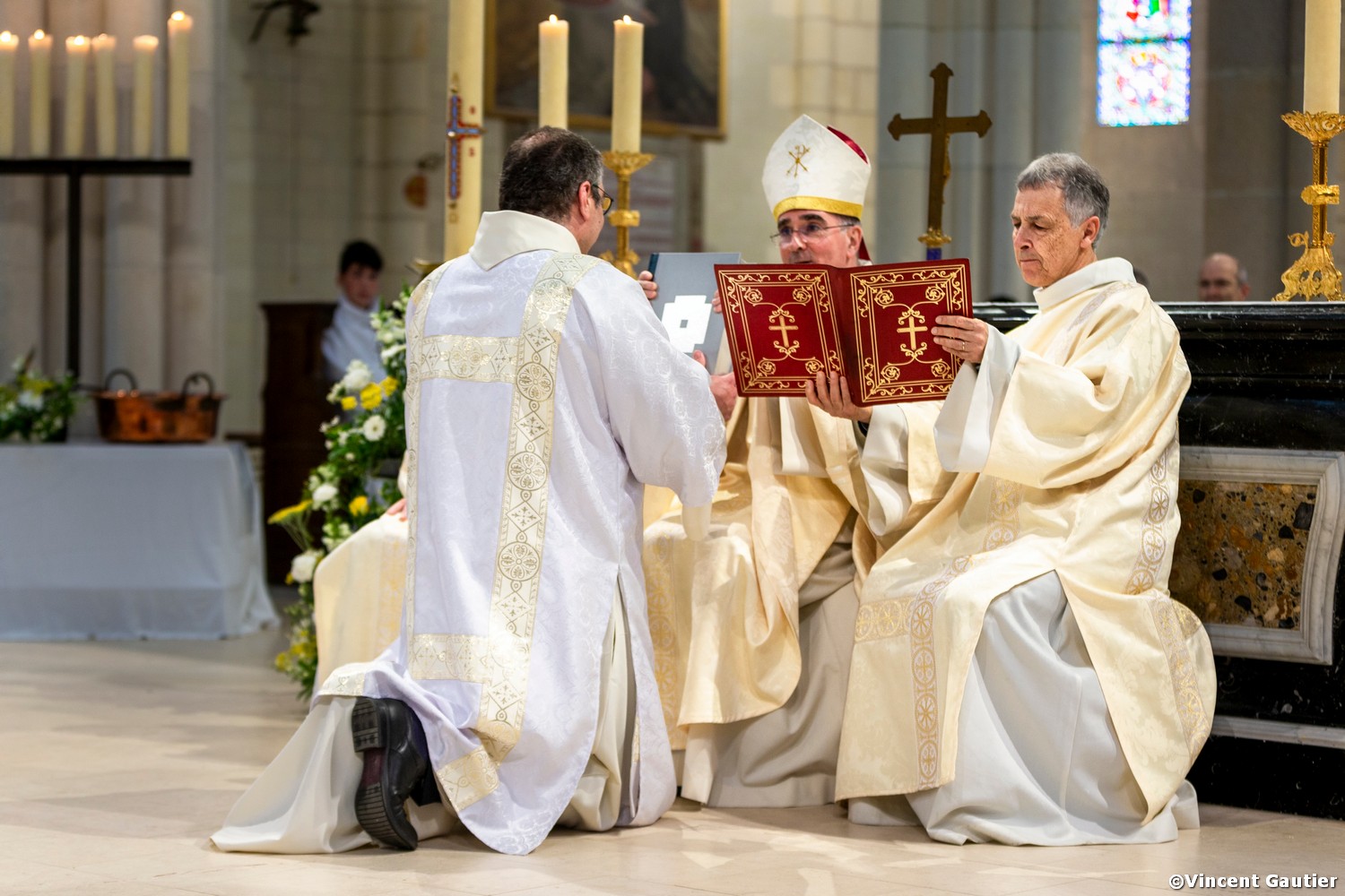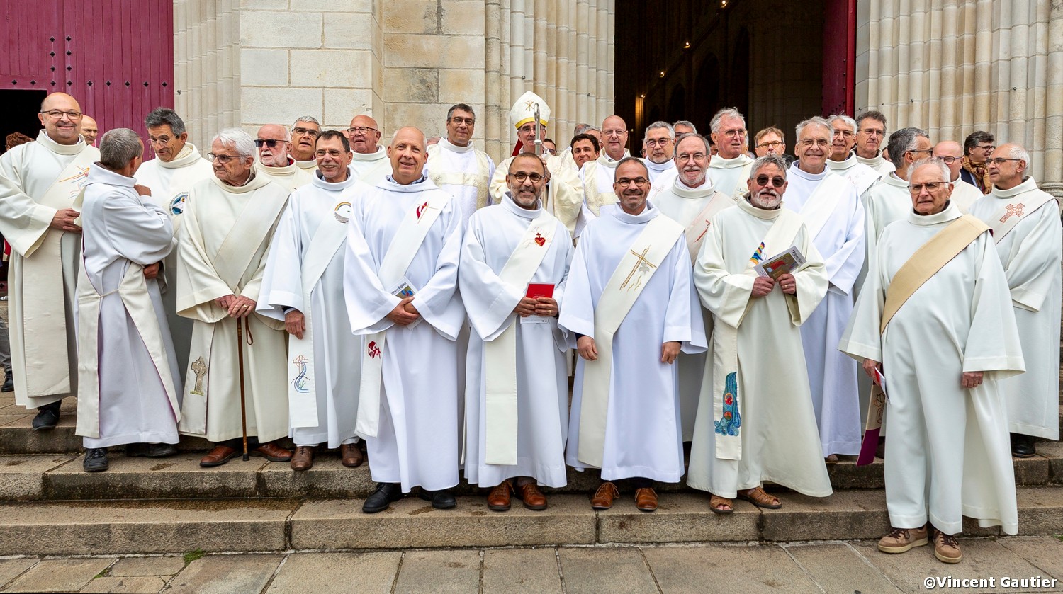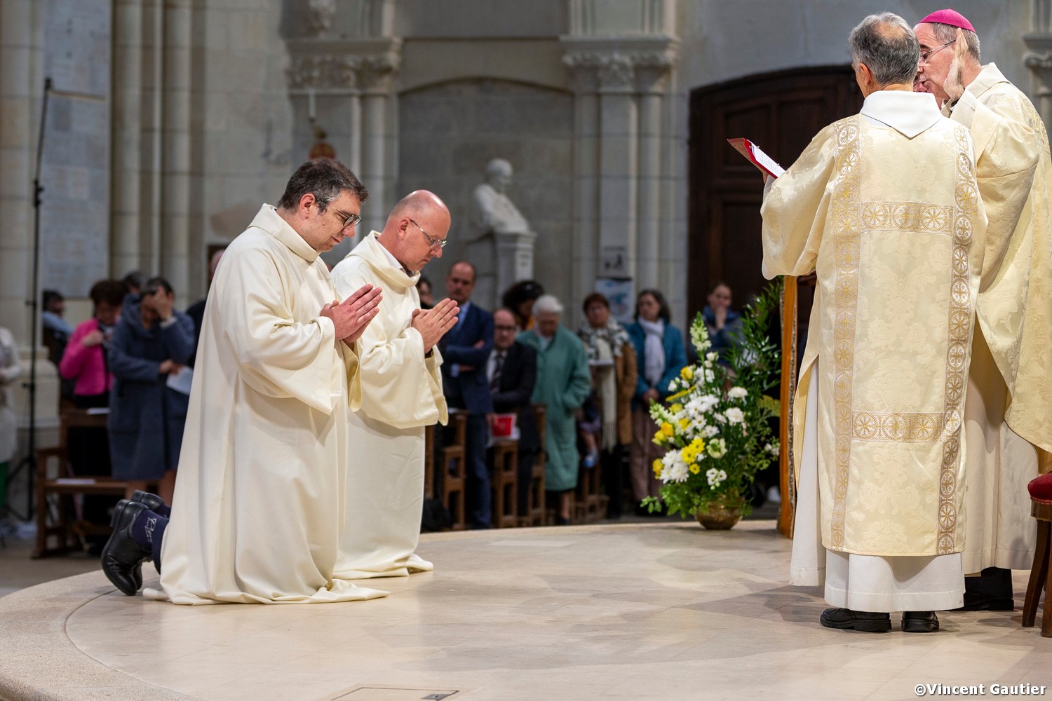 Le 26 avril 2025, Mgr Percerou présidait la célébration d’ordination diaconale de Nicolas Jean et François Proux, en la basilique Saint-Donatien de Nantes. Leurs familles et des paroissiens de Saint-Martin-du-Val-d’Erdre, et Saint-Pierre-sur-Loire et de Sainte-Marie-du-Val-de-Sèvre étaient en fête pour entourer les deux ordinands.