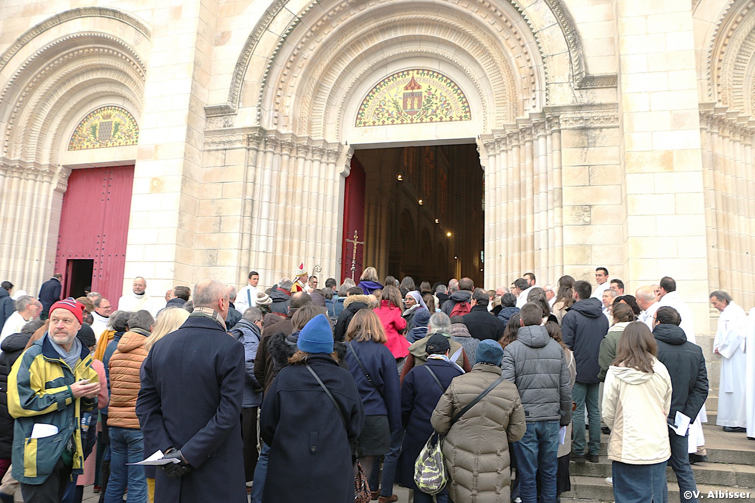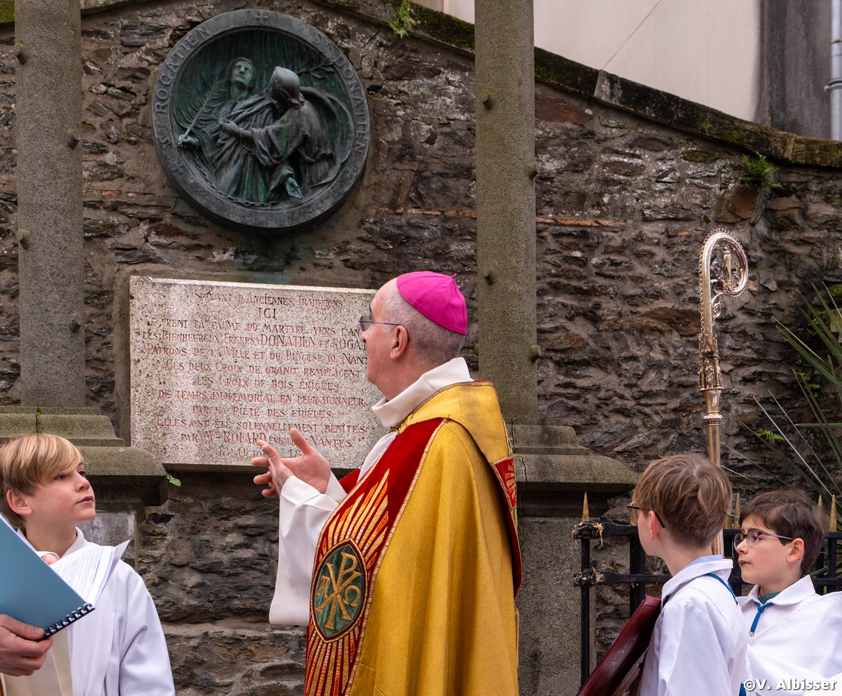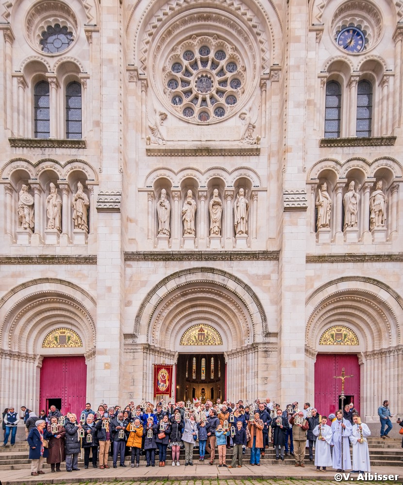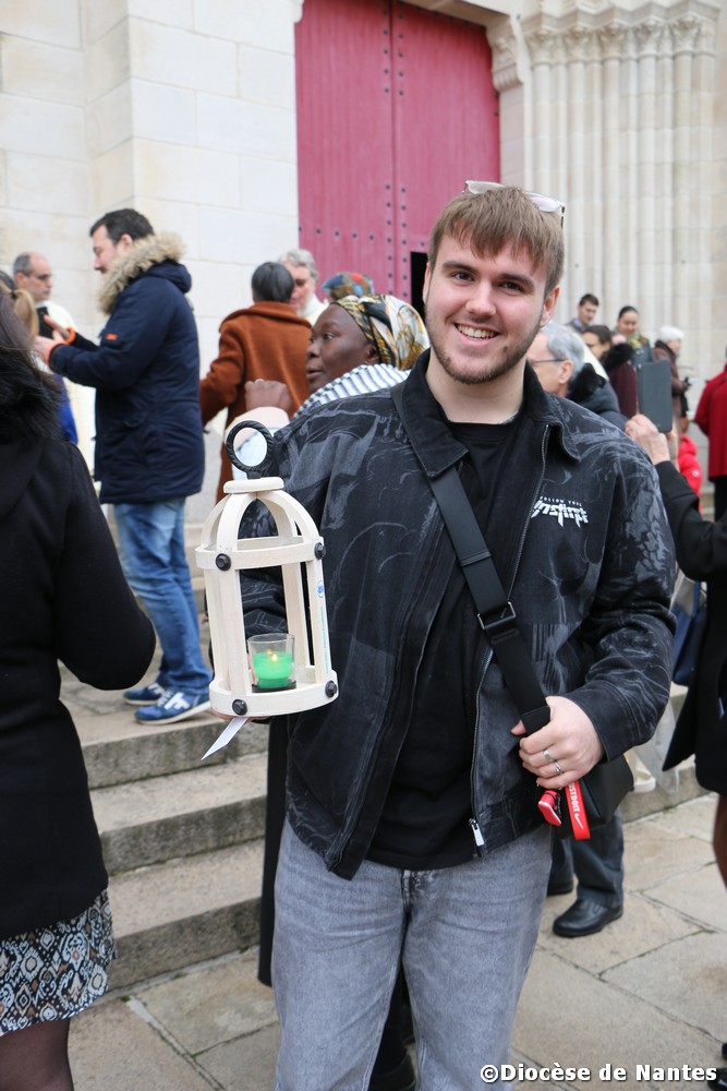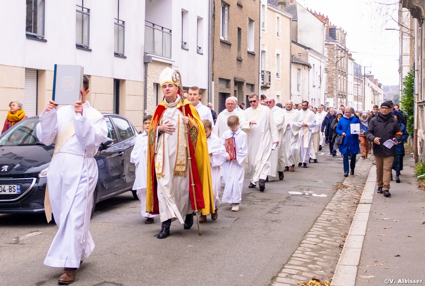 A 10h30, ce dimanche 29 décembre 2024, une procession est partie de la rue Dufour, au pied des calvaires jumeaux du martyre des saints Donatien et Rogatien, pour se rendre à la basilique située à quelques centaines de mètres de là. Sur les marches de la basilique, Monseigneur Percerou a introduit cette célébration solennelle à laquelle participaient des délégations de chaque paroisse du diocèse. Elles ont reçu une lanterne, symbole de la lumière qui éclairera cette année jubilaire à travers la Loire-Atlantique.