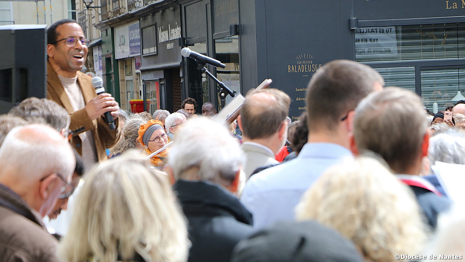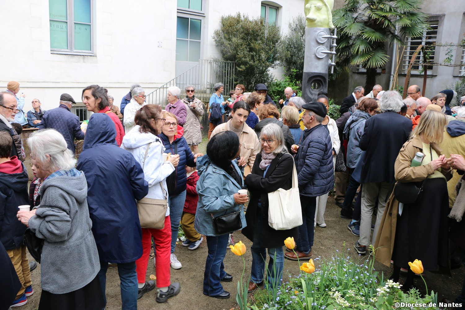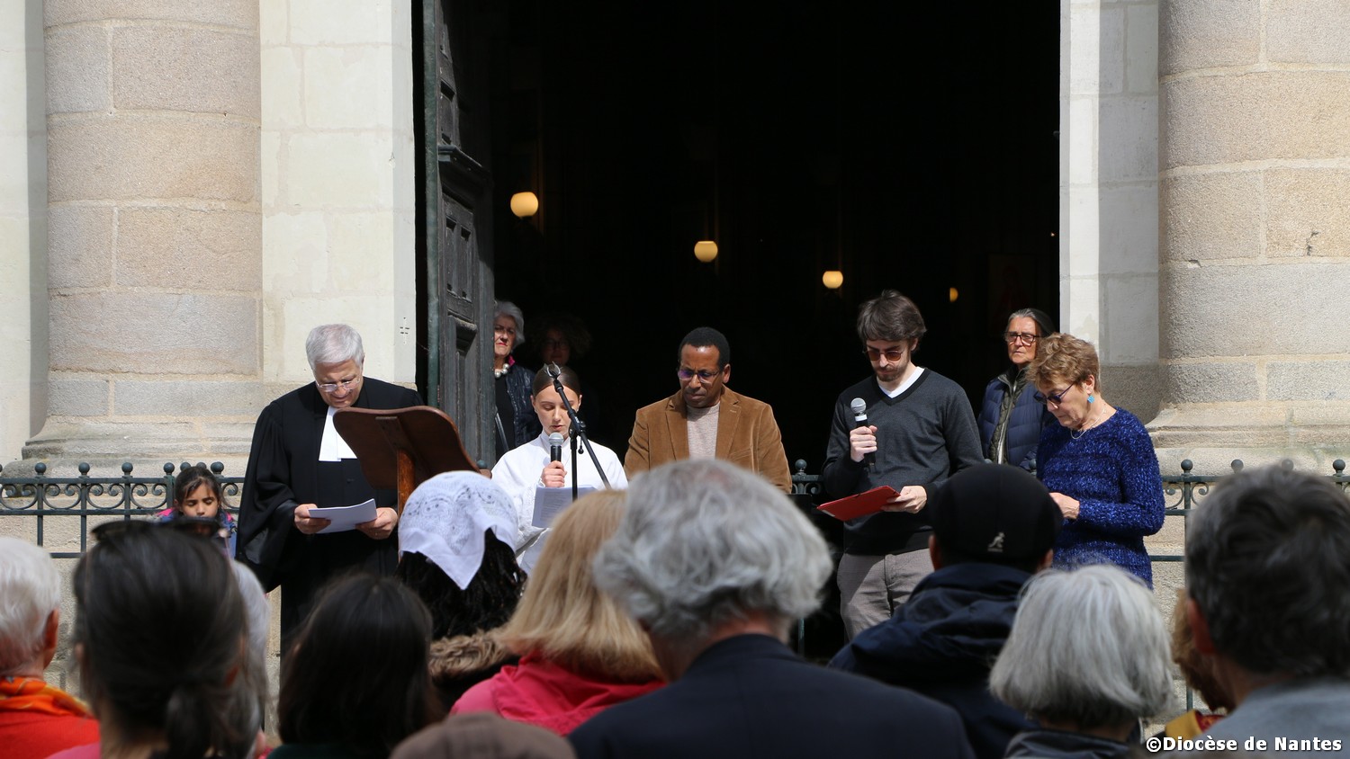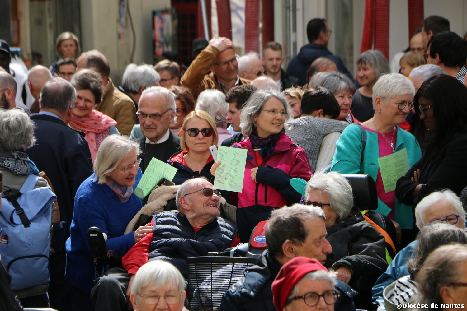 Près de 500 fidèles ont répondu présent à cette invitation qui s’est déroulée joyeusement sur la place Sainte-Croix de Nantes. Beaucoup d’émotion pour cette célébration interconfessionnelle introduite par des chants issus des répertoires des différentes confessions chrétiennes représentées. Un grand goûter de Pâques a suivi, autour et dans le Passage Sainte-Croix qui était ouvert pour l’occasion. Tous ont pu y dialoguer, se rencontrer, le visiter.