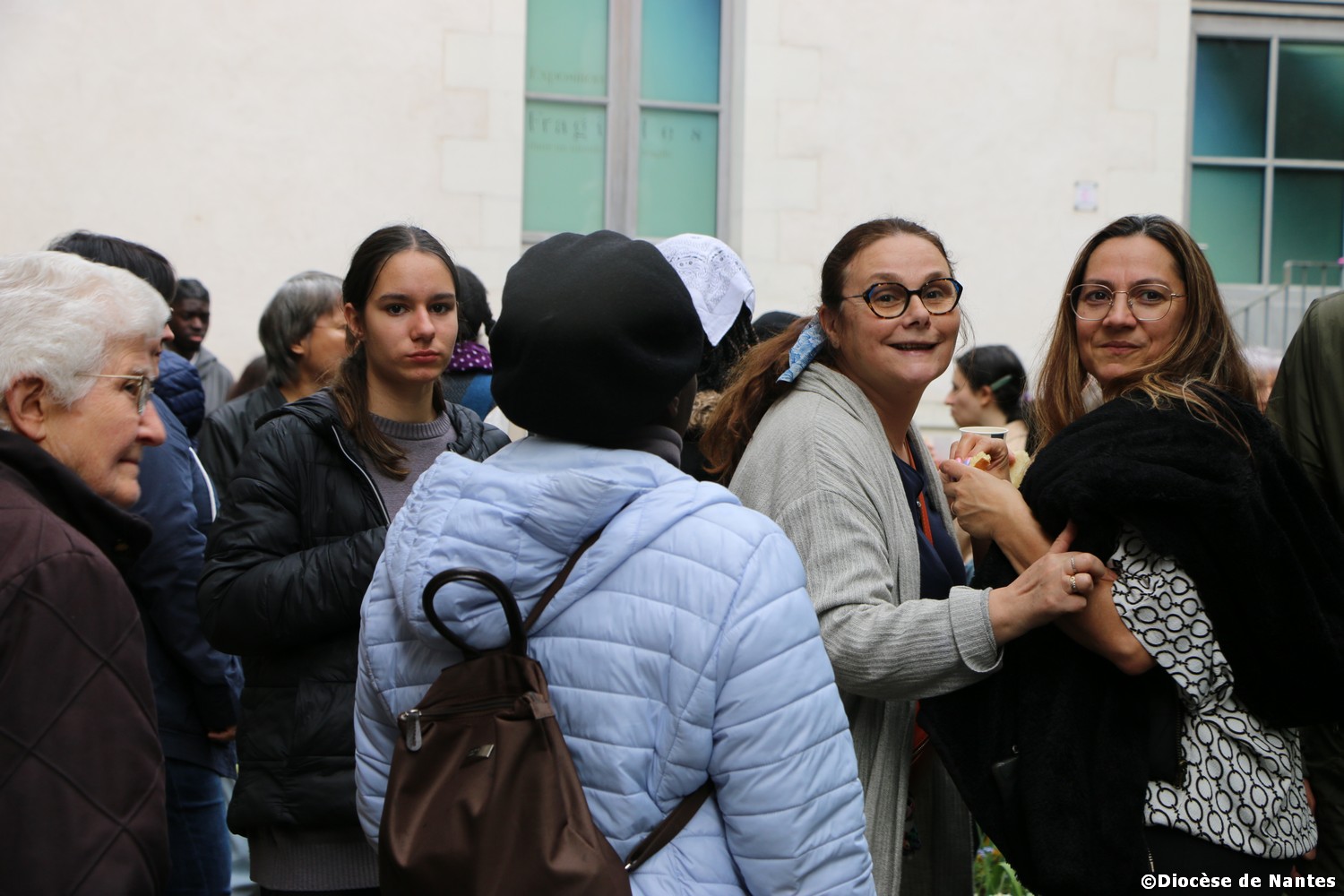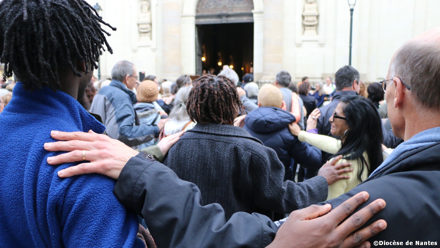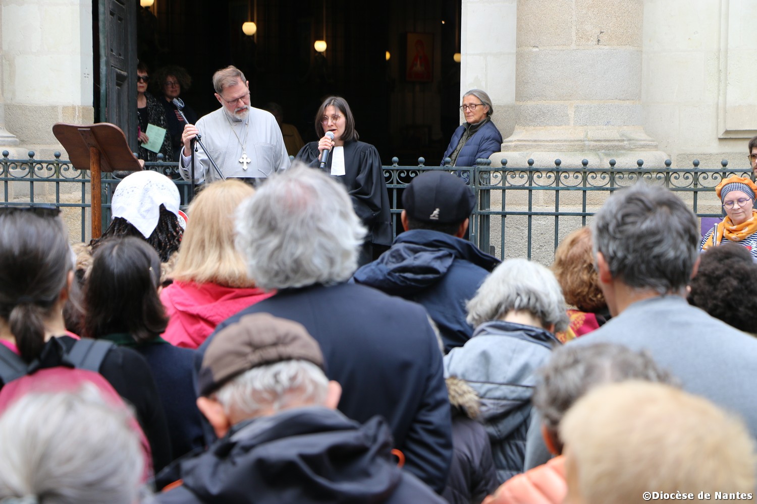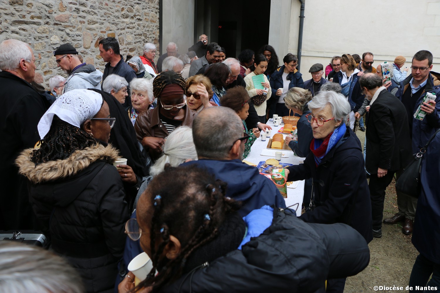 Près de 500 fidèles ont répondu présent à cette invitation qui s’est déroulée joyeusement sur la place Sainte-Croix de Nantes. Beaucoup d’émotion pour cette célébration interconfessionnelle introduite par des chants issus des répertoires des différentes confessions chrétiennes représentées. Un grand goûter de Pâques a suivi, autour et dans le Passage Sainte-Croix qui était ouvert pour l’occasion. Tous ont pu y dialoguer, se rencontrer, le visiter.