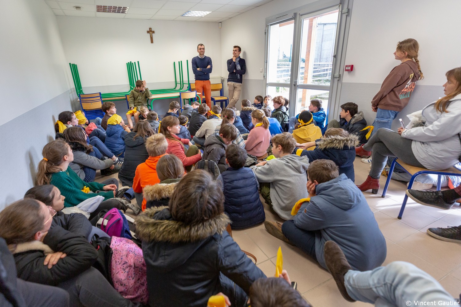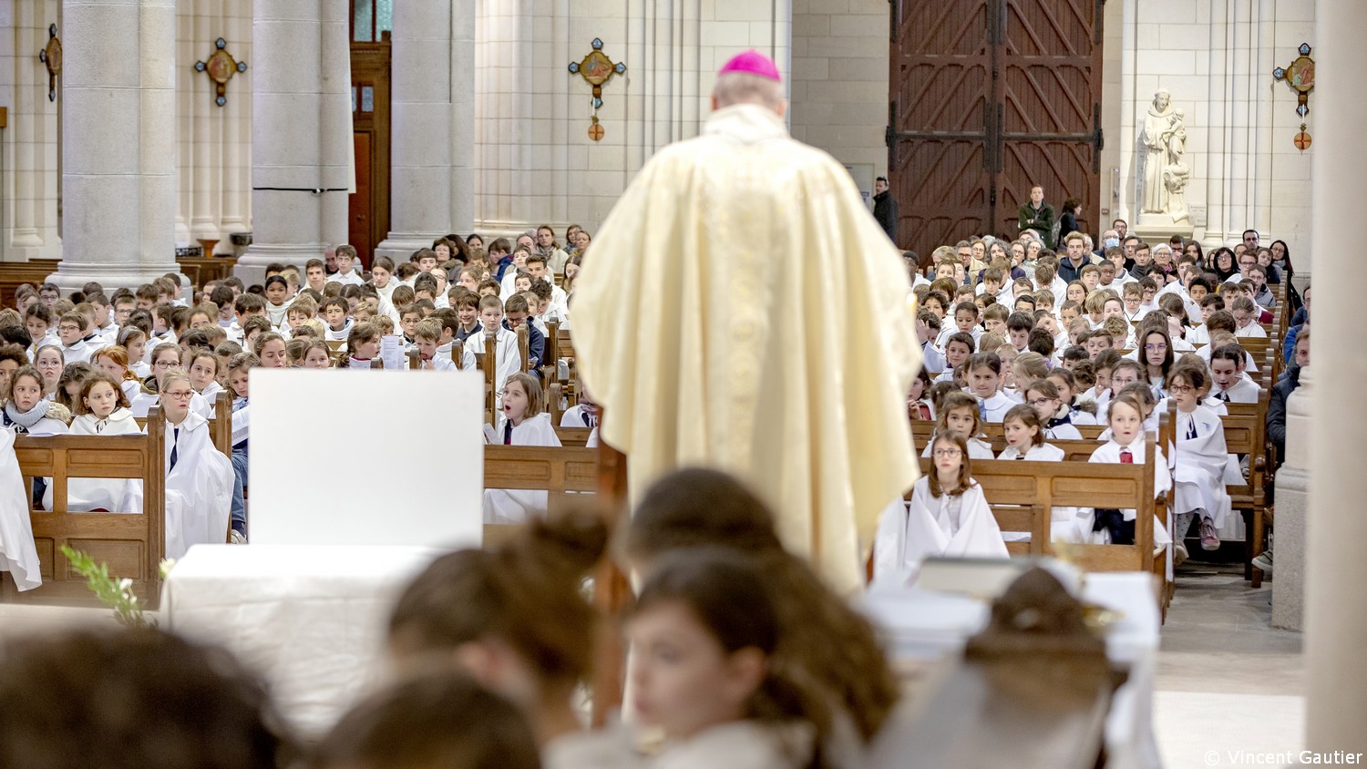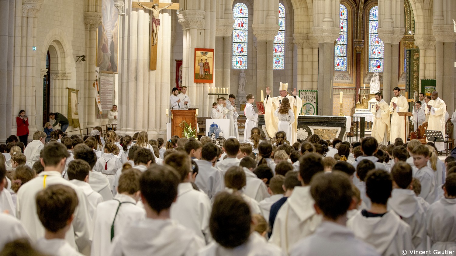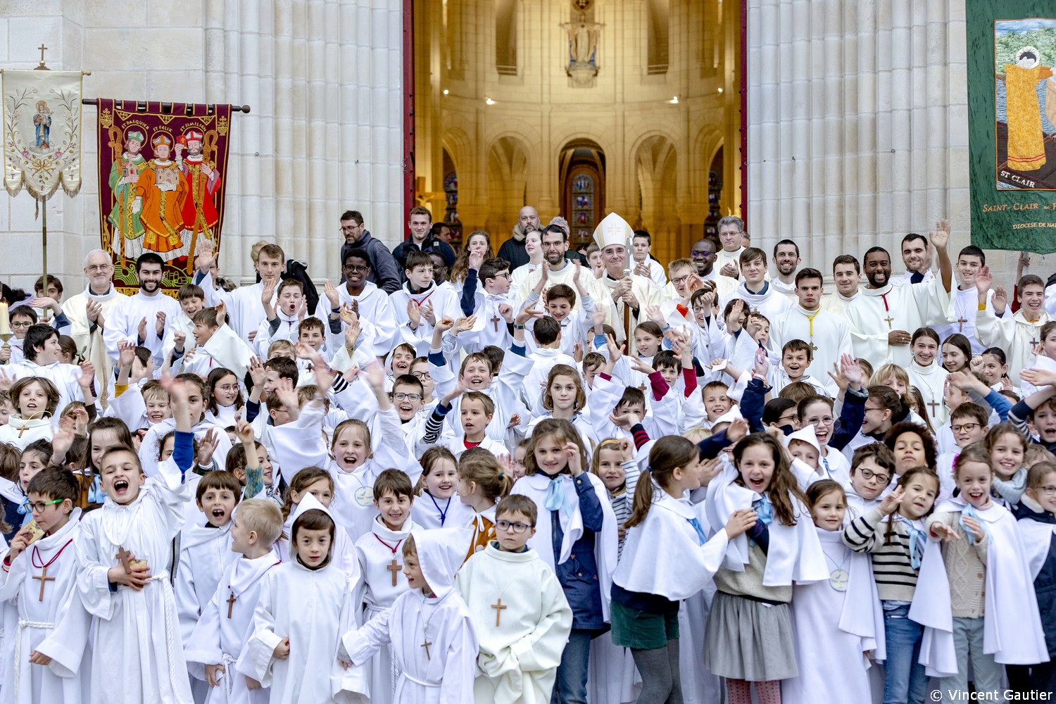 Cette rencontre joyeuse a donné lieu à un grand jeu suivi d’ateliers de bricolage, d’enseignements et de témoignages avant la célébration de la messe présidée par Mgr Percerou. Les enfants et adolescents étaient venus avec les bannières de leurs paroisses qu’ils étaient fiers de porter en procession dans la Basilique.