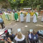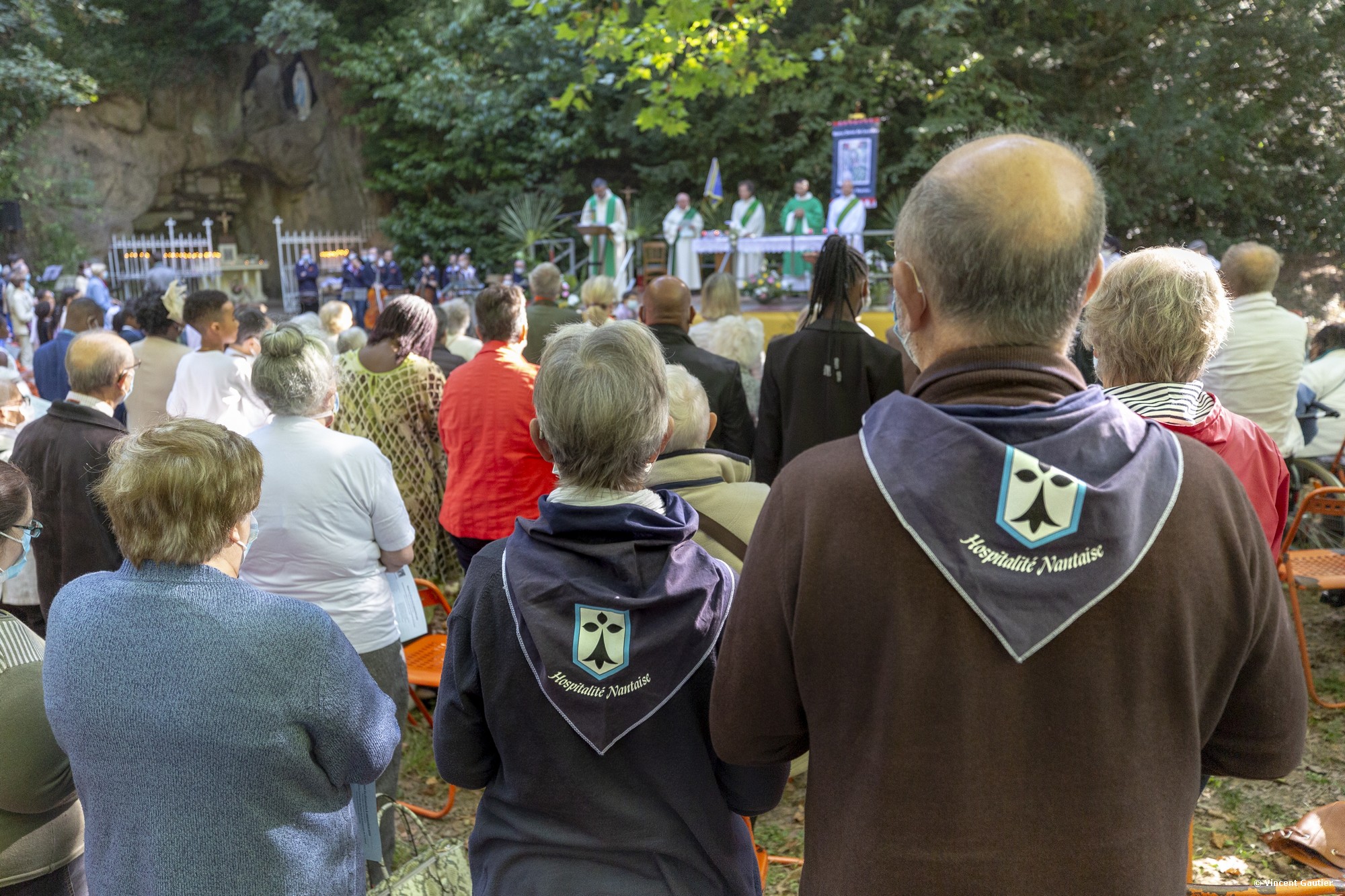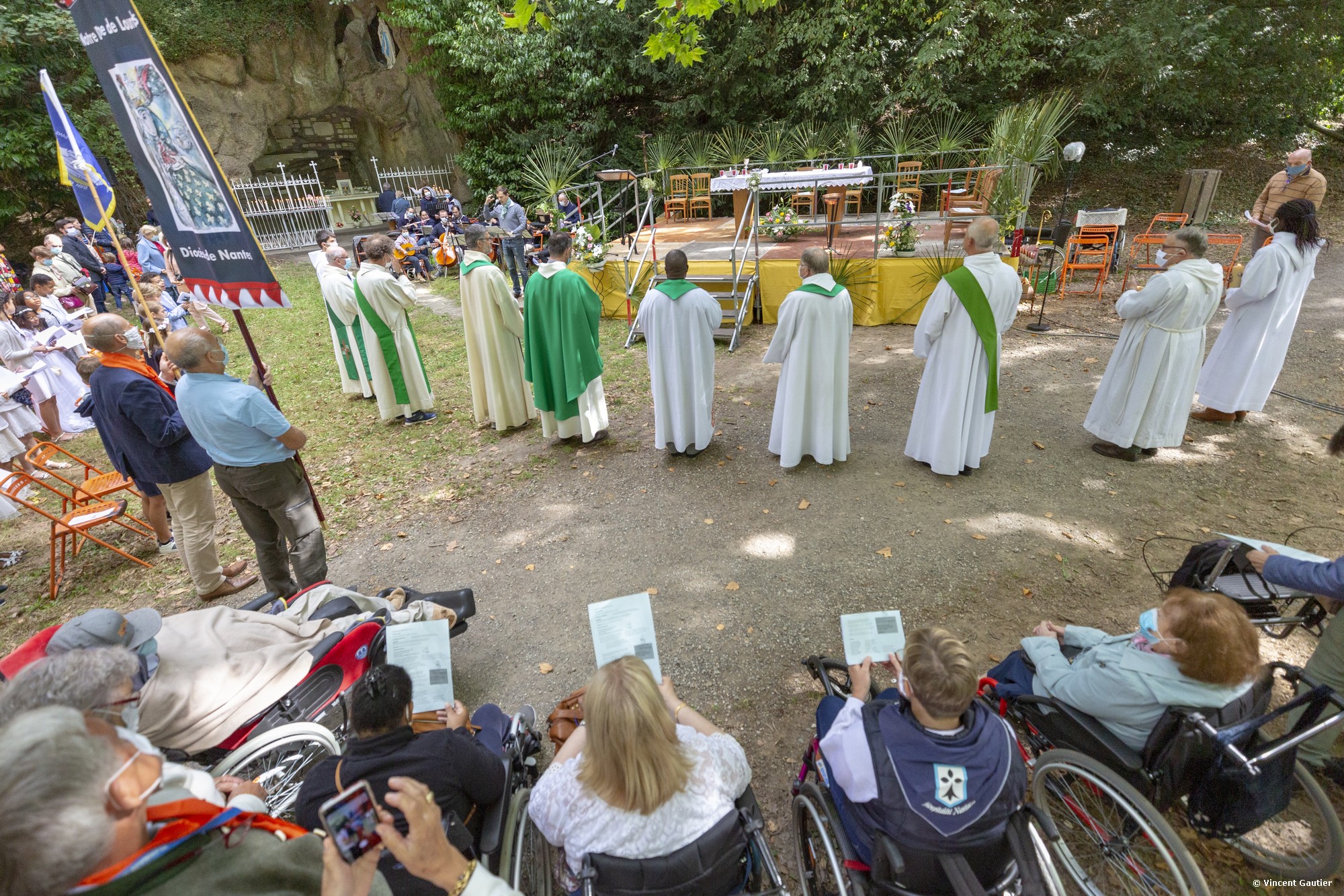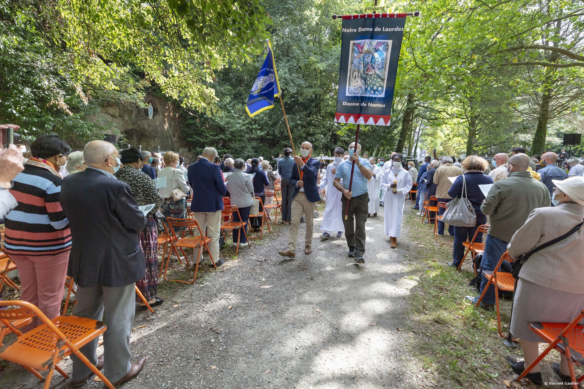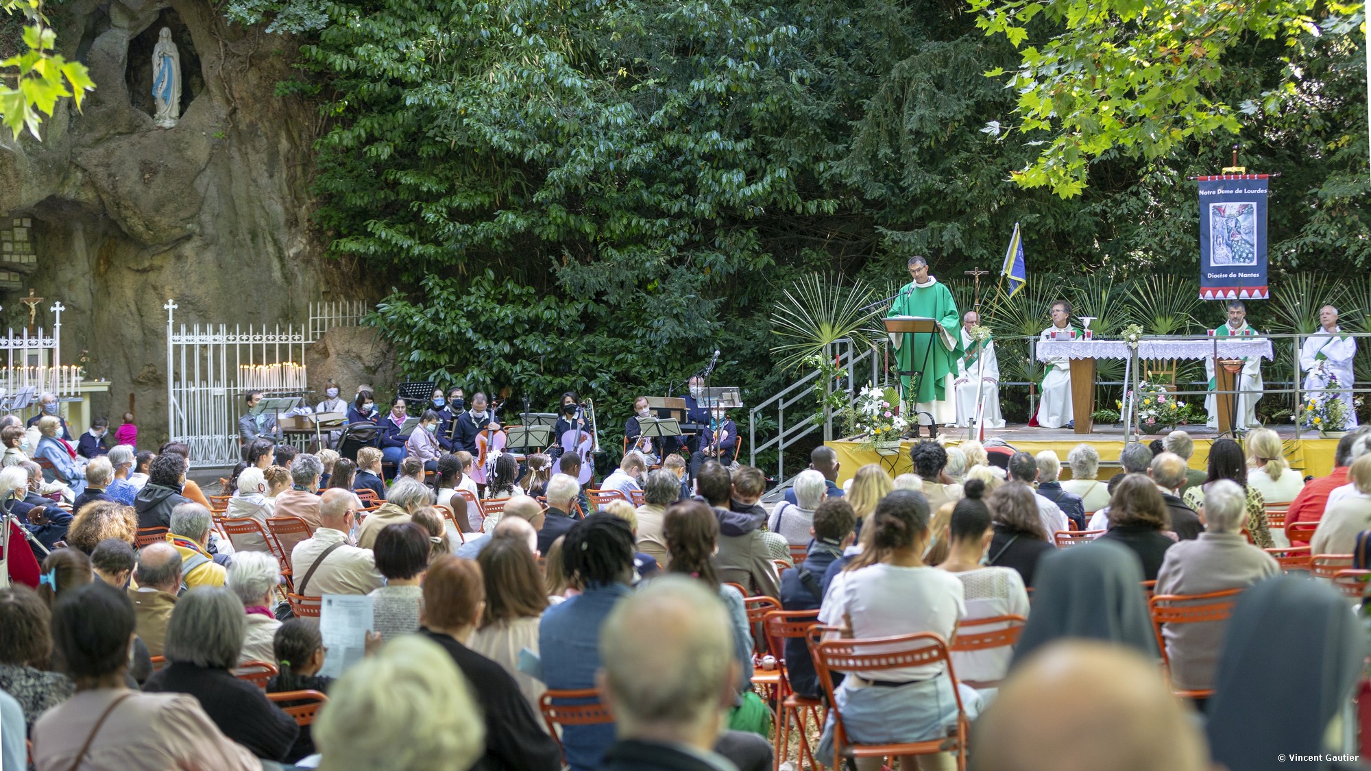 Le père Sébastien de Groulard présidait dimanche 6 septembre 2020 le pèlerinage à la grotte de Lourdes, du Pont du Cens, à Nantes. Malgré le contexte sanitaire, les pèlerins étaient au rendez-vous. Alors qu’il n’avait pas été possible de nous vivre au printemps, ni même cet été de pèlerinage diocésain à Lourdes plus de 700 personnes participaient à ce rendez-vous auprès de Marie.