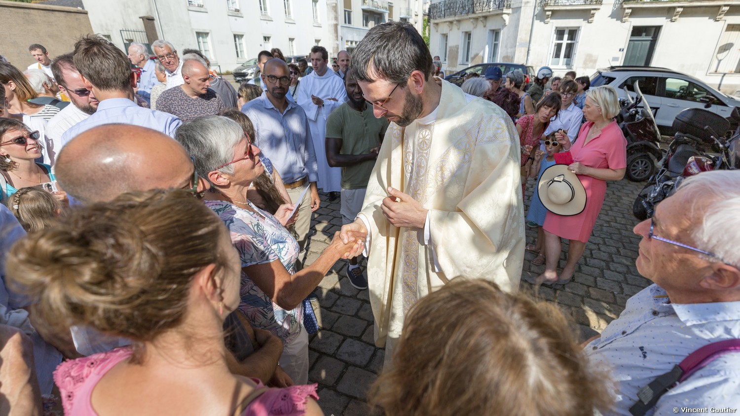Avant la bénédiction finale, Monseigneur Percerou, a dévoilé les nominations pour ces deux nouveaux prêtres, à compter du 1er septembre 2023. L’abbé Pierre Biehler est nommé curé de la paroisse Saint-Gildas-des-Sources (Saint-Gildas-des-Bois). Une charge qu’il accomplira, dans sa première année, avec l’accompagnement fraternel de l’abbé Arnaud de Guibert, lui-même nommé doyen pour la zone pastorale Sillon. L’abbé Jean-Louis Gomis est nommé coopérateur pour les deux paroisses de Sainte-Croix-en-Châteaubriant et Saint-Joseph-du-Don (Moisdon-la-Rivière).