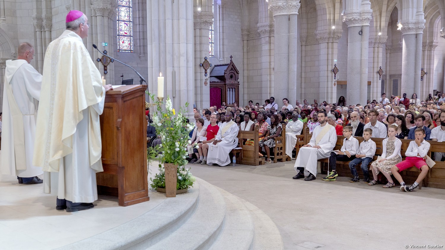 Dans son homélie, Mgr Percerou a invité Pierre et Jean-Louis à regarder attentivement l’Eglise de Loire-Atlantique : « chacun de ses membres, enfants, jeunes, adultes, hommes, femmes, de toutes conditions, de cultures diverses, chacun avec son histoire. C’est pour eux tous que vous devenez prêtres !… Ils ont tenu à être là pour manifester leur joie de recevoir deux nouveaux pasteurs qui les conduiront, au nom et en la personne du Christ, vers le Père. C’est bien pour cette Eglise de Nantes que je vais vous ordonner et il faudra l’aimer malgré ses imperfections, mais aussi avec ses élans, ses dynamismes et l’Esprit qui la suscite. Oui, aimez-là cette Église que vous êtes appelés à servir toute votre vie. »
