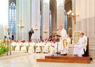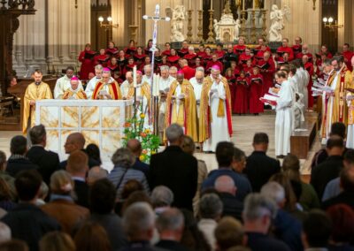 Mgr Laurent Percerou, évêque de Nantes, a exprimé son « émotion » de retrouver la cathédrale, « encore convalescente mais bien debout ». Une émotion encore plus palpable le lendemain à 15h30, lors de la messe de réouverture, célébrée en présence de 16 évêques, de nombreux prêtres et diacres, ainsi que de délégations venues de toutes les paroisses du diocèse.