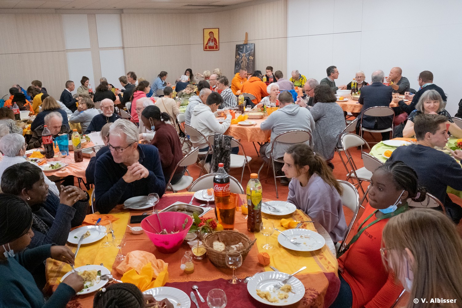 Puis les uns et les autres se sont dirigés vers la salle La Fontaine, où ils étaient accueillis par une équipe de lycéens… et Monseigneur Percerou lui-même, venu partager le déjeuner. De l’avis général, le repas était très bon. L’ambiance était douce et fraternelle. Et les bras n’ont manqué ni pour le service, ni pour la vaisselle !
