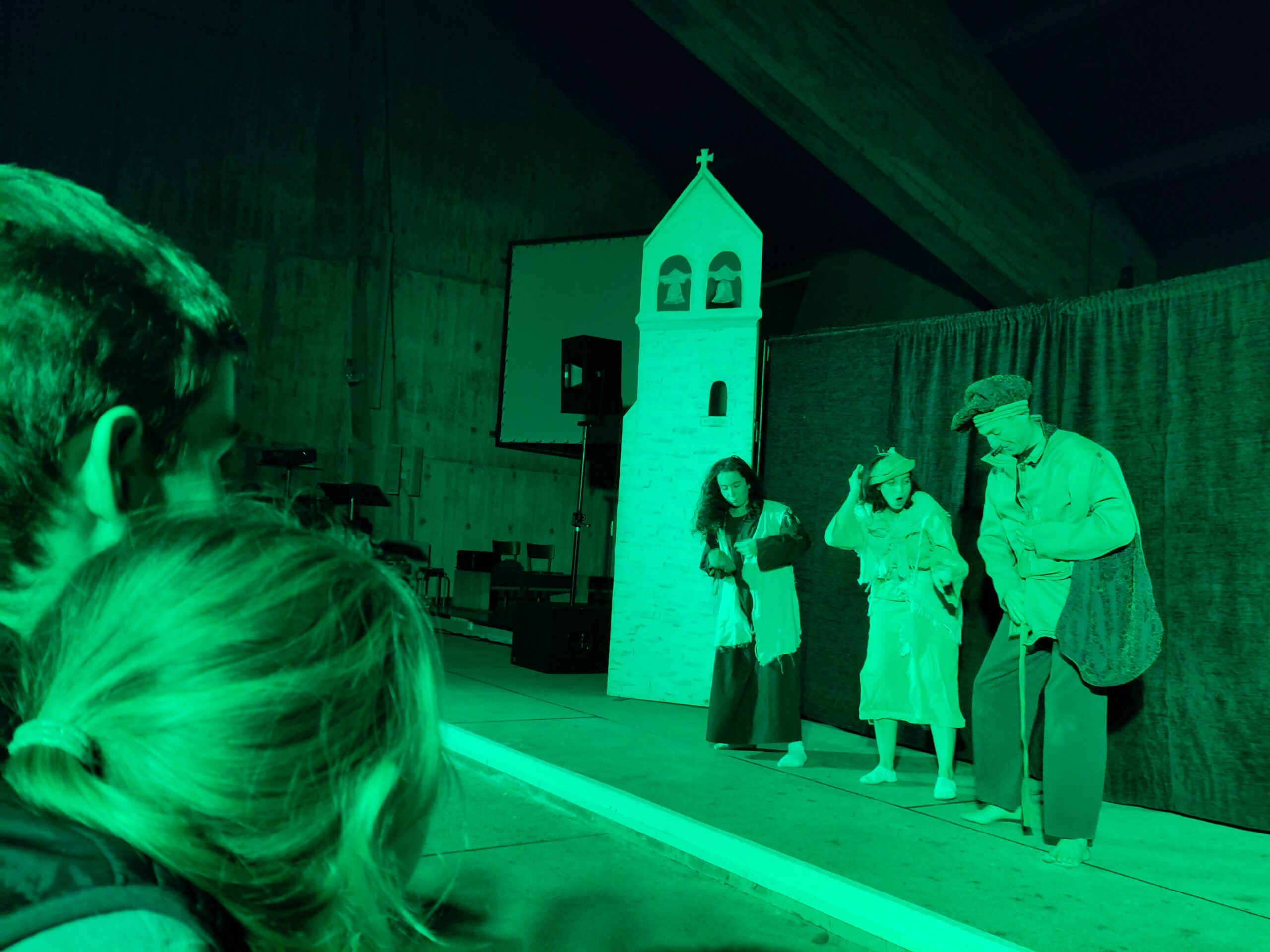 Le jeu des couleurs, les couleurs des étoffes, les mimes des artistes, la voix de la conteuse imprégnée de douceur et force, un texte simple mais puissant, le décor simple et parlant, les chants et la musique : tout nous a porté à la prière. Quelques larmes ont coulé dans l’assemblée… Saint François déplace, questionne, touche le cœur !