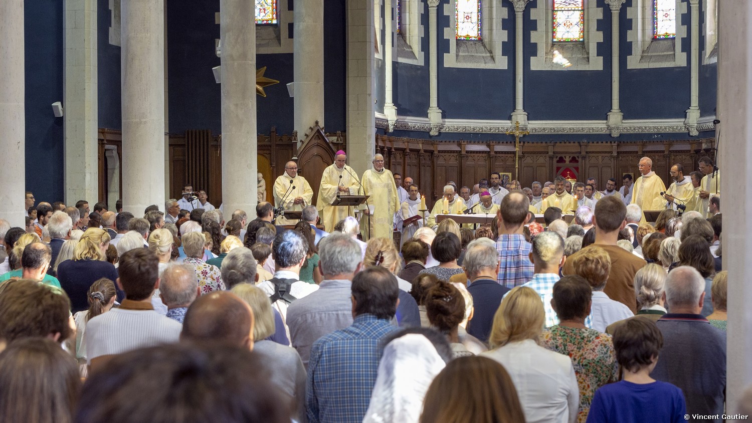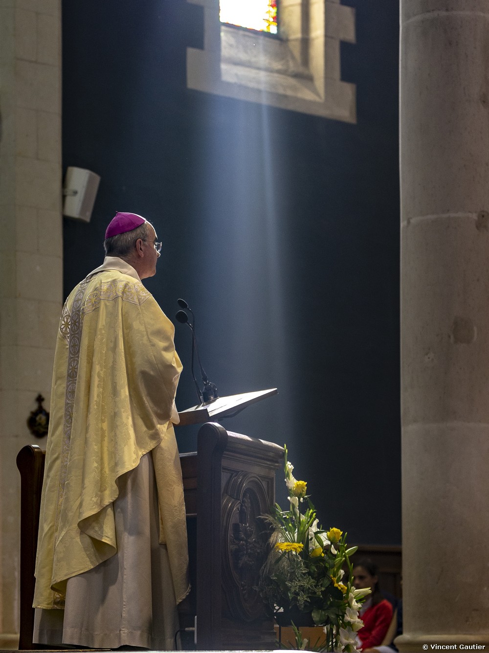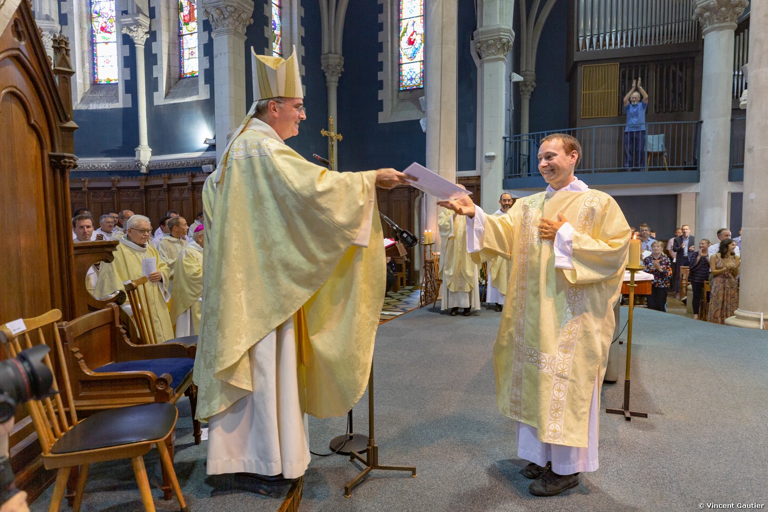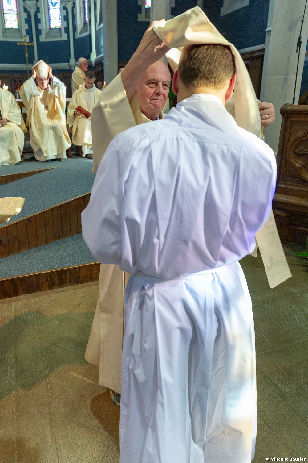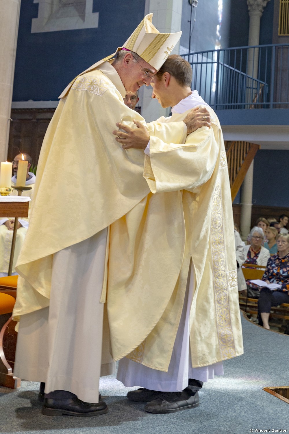 « en devenant diacre de l’Église, Steven tu n’es pas appelé à renoncer à être le plus grand pour être le chef mais tu es appelé à reconnaître et à manifester par toute ta vie que le plus grand, c’est le plus jeune et que le chef est celui qui sert. Il te faudra sans cesse demeurer fidèle au Christ, le serviteur par excellence, pour pouvoir te tenir au cœur de l’Église et du monde comme celui qui sert…//…Tous nous sommes appelés à prendre la place du plus jeune. Tous nous sommes appelés à être comme celui qui sert. Tous nous sommes appelés à demeurer en Christ, le serviteur par excellence, quand bien même nous savons que faire un tel choix interroge et surprend. C’est pourquoi il est essentiel que cette exigence évangélique du service des frères puisse être portée dans un ministère ordonné, le diaconat, afin que soit manifesté, au cœur de l’Église et du monde, l’unique commandement de l’amour qui seul conduit à la vraie vie… »