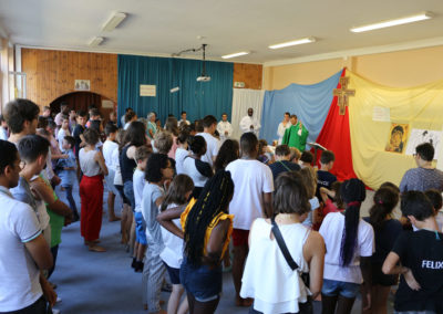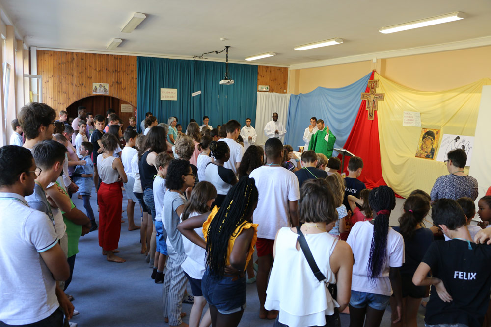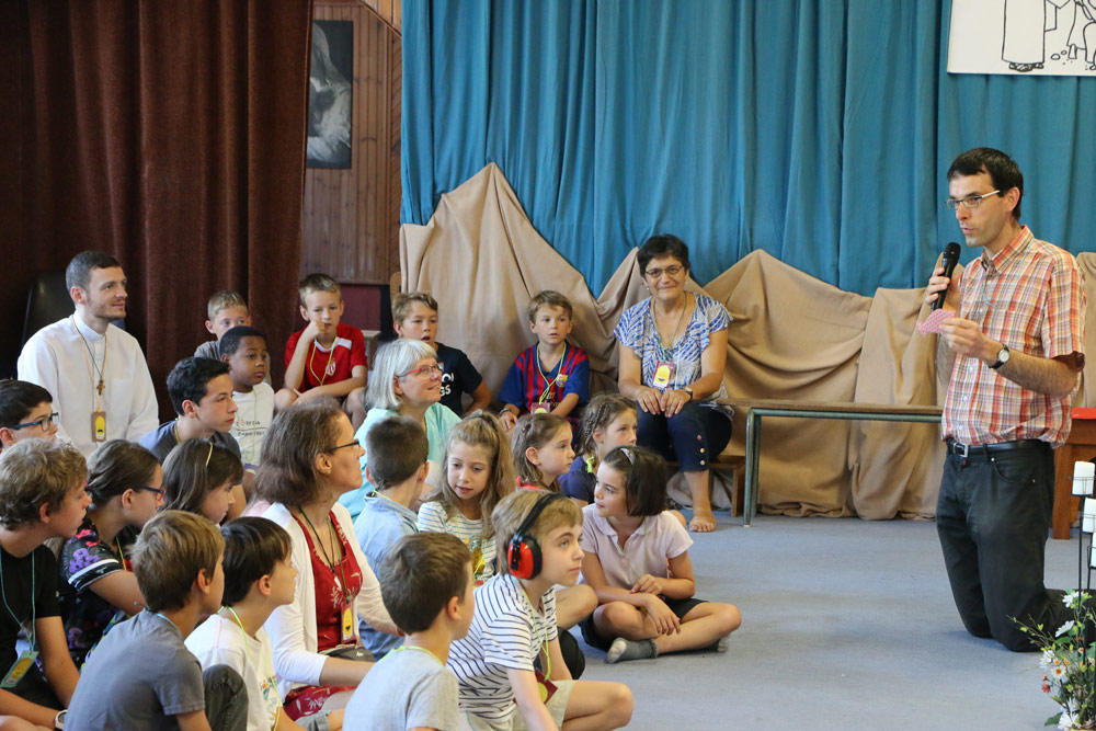 28 animateurs sont au service de cette organisation. La journée s’articule entre temps de louange, de fraternité, moment de désert pour intérioriser et s’approprier les textes de l’Evangile préalablement partagés. La messe quotidienne conclut la matinée. L’après-midi est l’occasion de grands jeux, de bricolages, il y a aussi des veillées, sans oublier les parties de foot et de « poule-renard-vipère » plébiscitées par les plus jeunes ! Les parents ainsi que des adultes bénévoles sont mis à contribution pour l’infirmerie, la cuisine, le ménage et l’accompagnement des plus jeunes dans les dortoirs la nuit… Tous profitent de l’Ecole de prière : les adultes prient les vêpres ensemble et sont encouragés à vivre les temps de désert, comme les plus jeunes.
