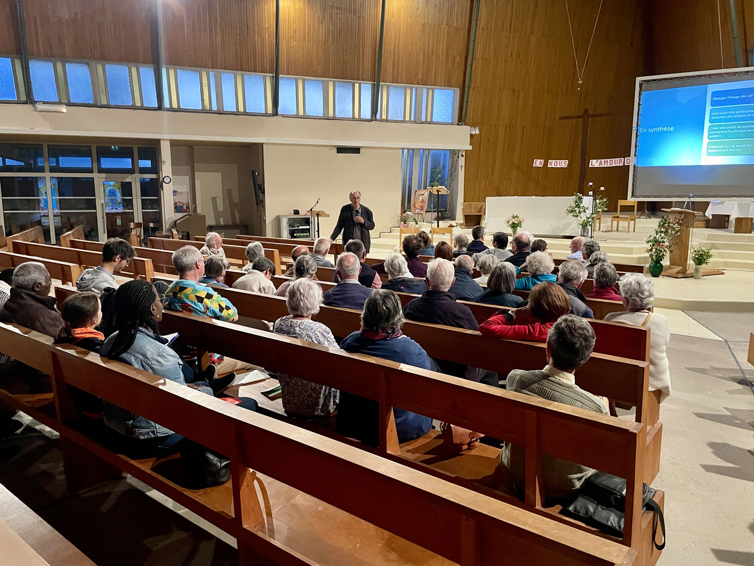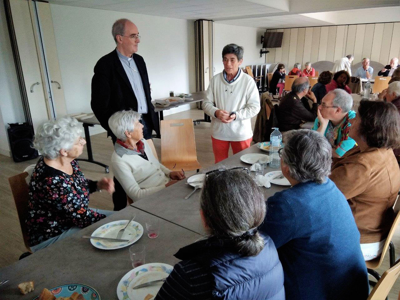 L’après-midi se déroulait aux Dervallières, et commença par un échange avec Mr Rebouh, maire adjoint, pour présenter le quartier et ses habitants, les préoccupations et les projets. Puis ce fut une rencontre avec l’association Les Deux Rives, qui accompagne collégiens et lycéens, suivie d’un échange avec des acteurs de la Maison de Quartier. Mgr Percerou, après une présentation de la paroisse, échangea ensuite avec des personnes engagées dans diverses équipes. D’autres paroissiens nous rejoignirent pour la messe, et le dîner fut très convivial. Enfin, la soirée d’information socio-économique avec Hervé Guéry fut l’occasion de remettre quelques idées en place concernant les quartiers populaires de l’agglomération.